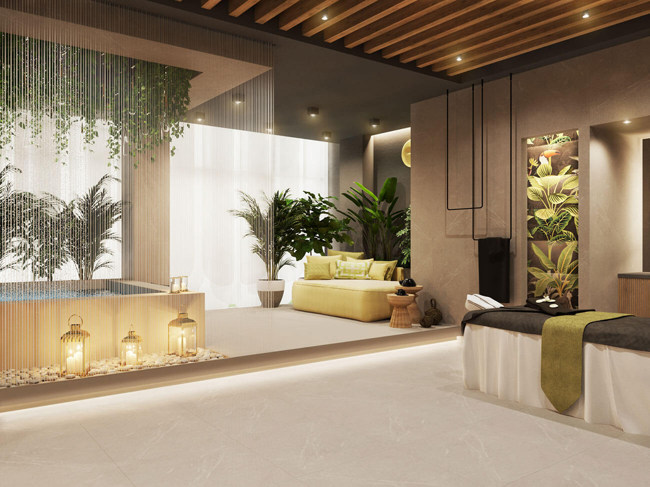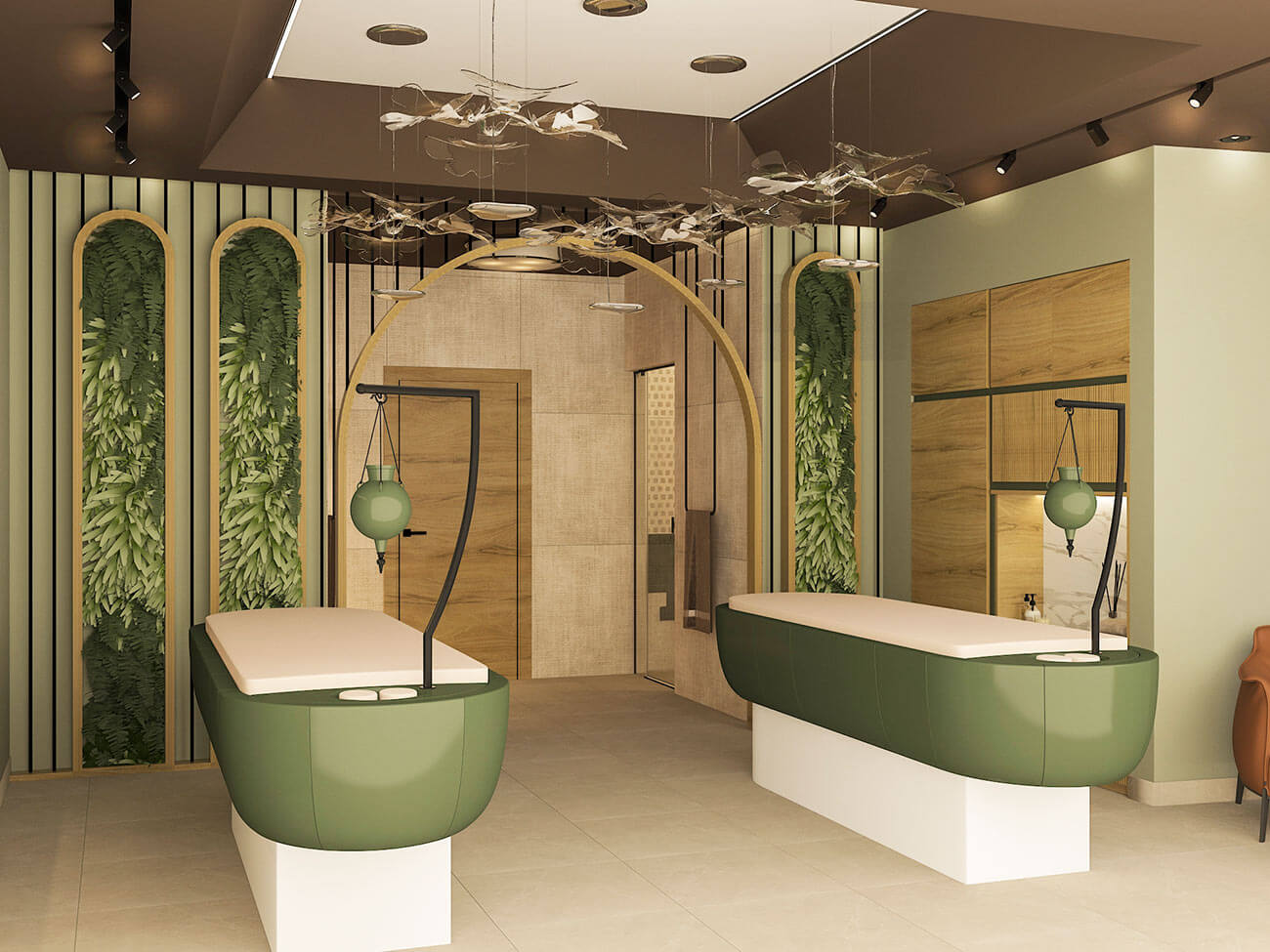 Спа-сьют оснащен уникальными керамическими столами Lithos Hilpert, позволяющими проводить как сухие, так и влажные спа-программы, в том числе аюрведические. Автоматическая регулировка высоты позволяет удобно работать специалисту и клиенту.