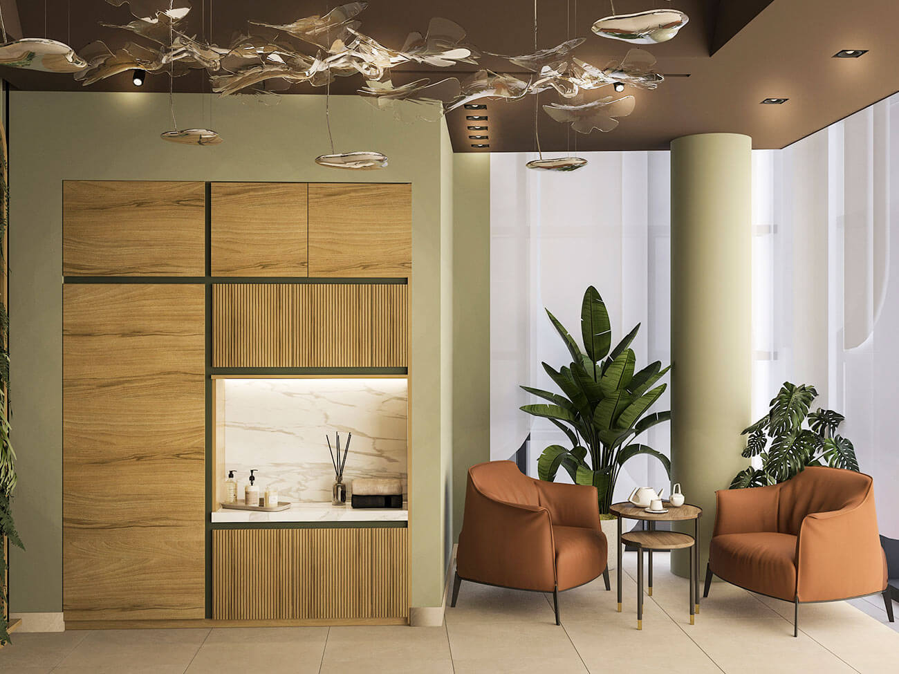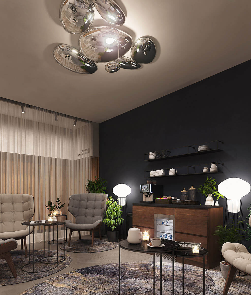 Холл для отдыха и чаепития объединяет помещение. Представлен в двух вариантах.