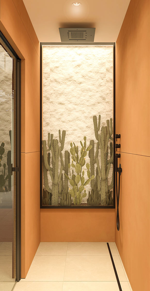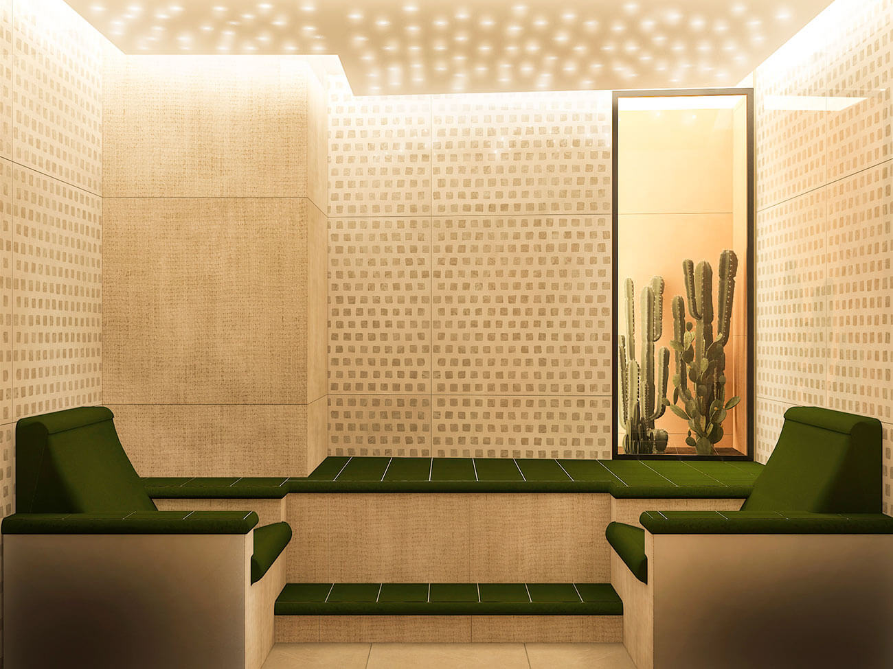 Функционально один из спа-сьютов оснащен паровой баней с двумя креслами из шамотной керамики Хилперт и лавкой по середине. Такая эргономика привносит разнообразие во времяприпровождение внутри хамам. Звездное небо, ароматерапия, теплые цвета, южные растения флорариума эмоционально направляют нас в теплый африканский климат. Дополняет впечатления тропический душ, отделанный терракотовым широкоформатным керамогранитом.