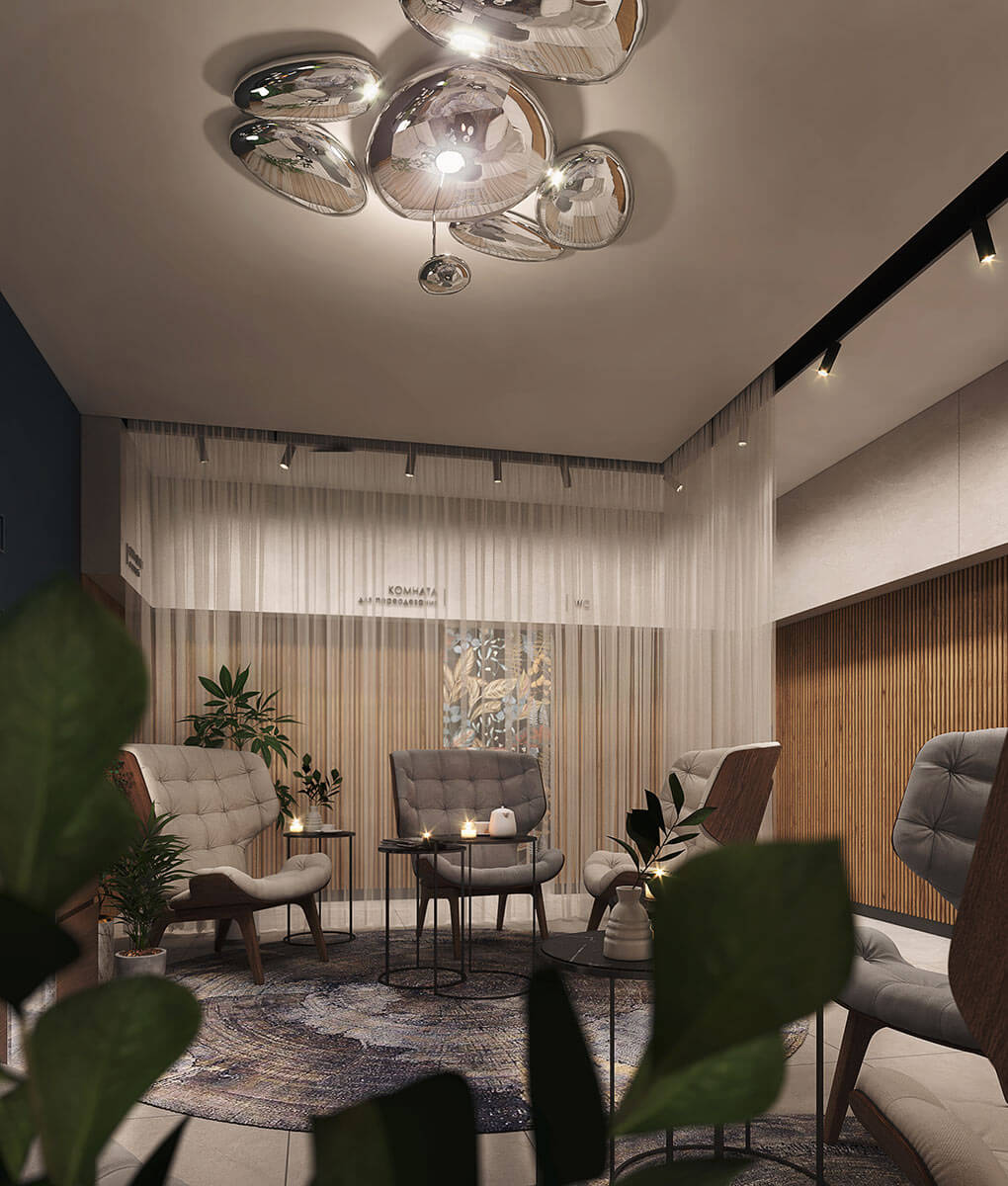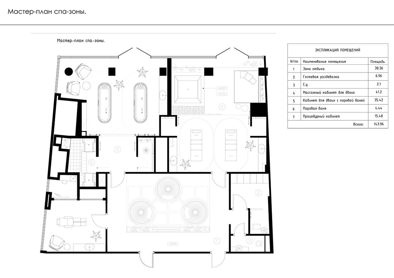 Основная задача — продолжить существующую архитектурную концепцию спа, предложив отдельные помещения спа-сьюта для получения спа-услуг, индивидуальных парений и расслабления, объединив их холлом для отдыха и чаепития.