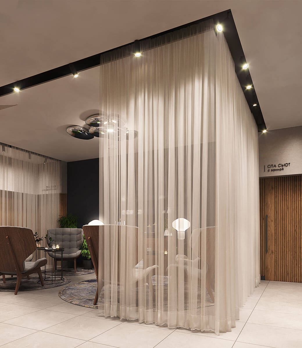 Процедурная зона отгорожена от влажной легкой нитяной шторой.