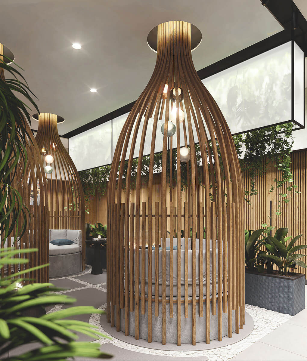 С необычными коконами, где ты можешь изолировано отдыхать и наблюдать за тем, что происходит вокруг, при этом быть скрытым от посторонних глаз.