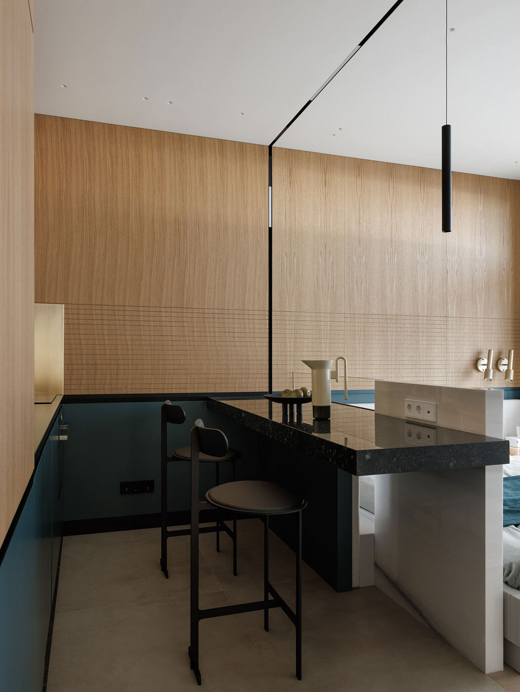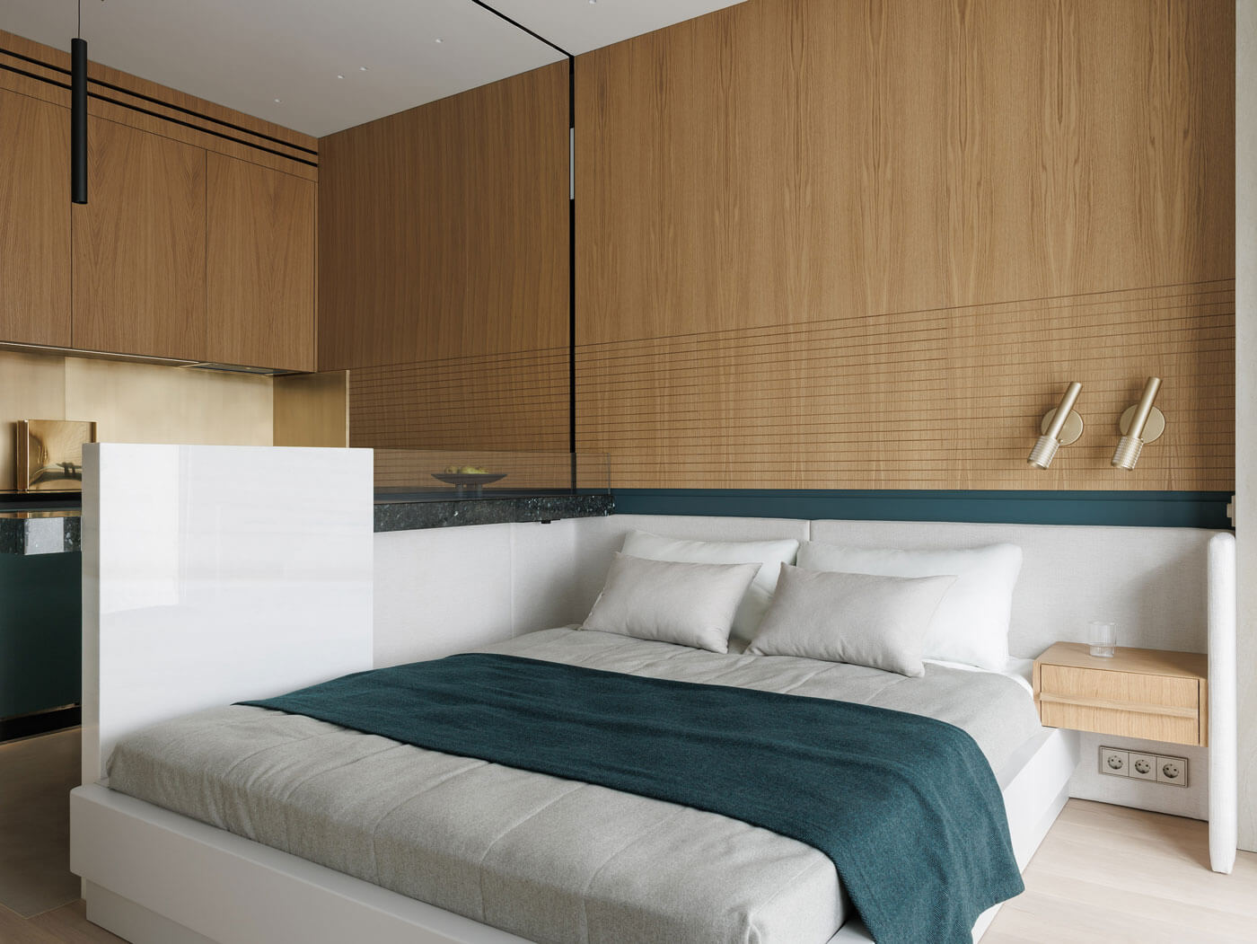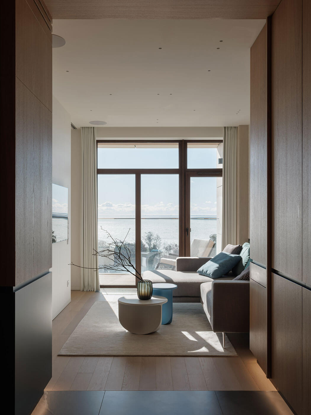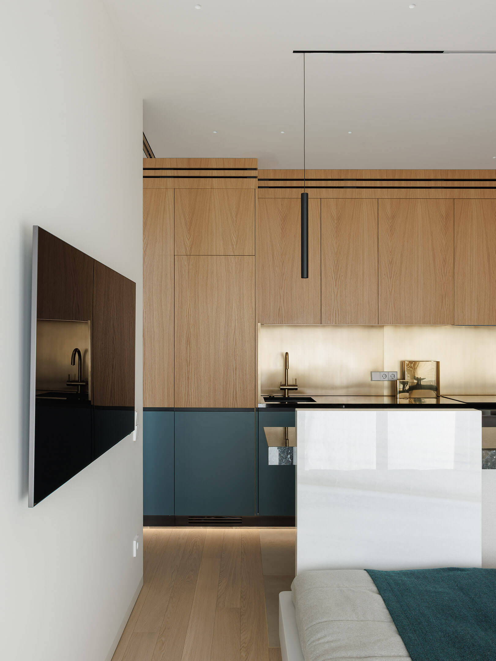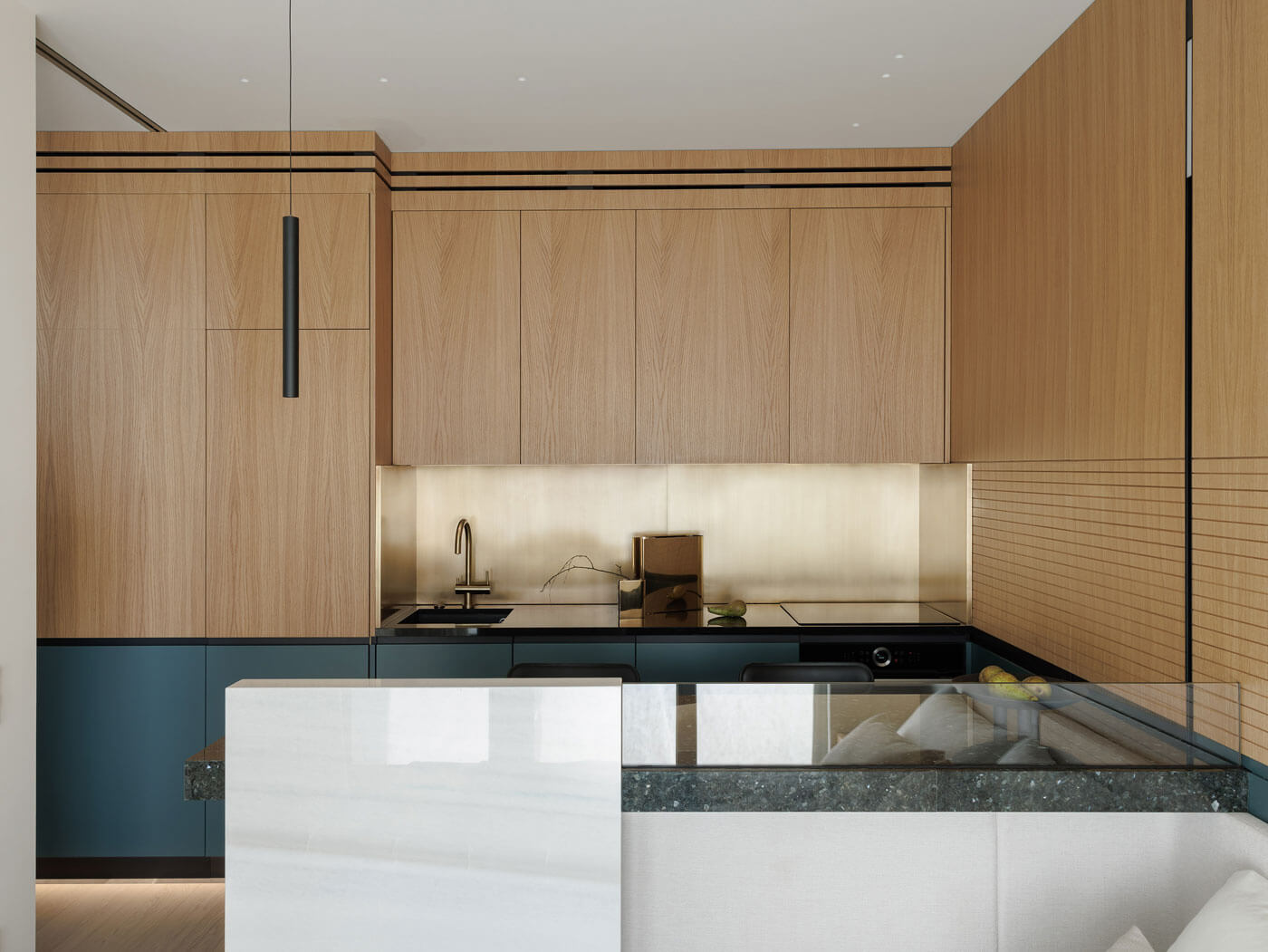 В отделке много золотого дерева и эмали цвета морской волны. Графика черной линии в облицовке панелей вторит линии горизонта и усиливает звучание солнечного дерева.