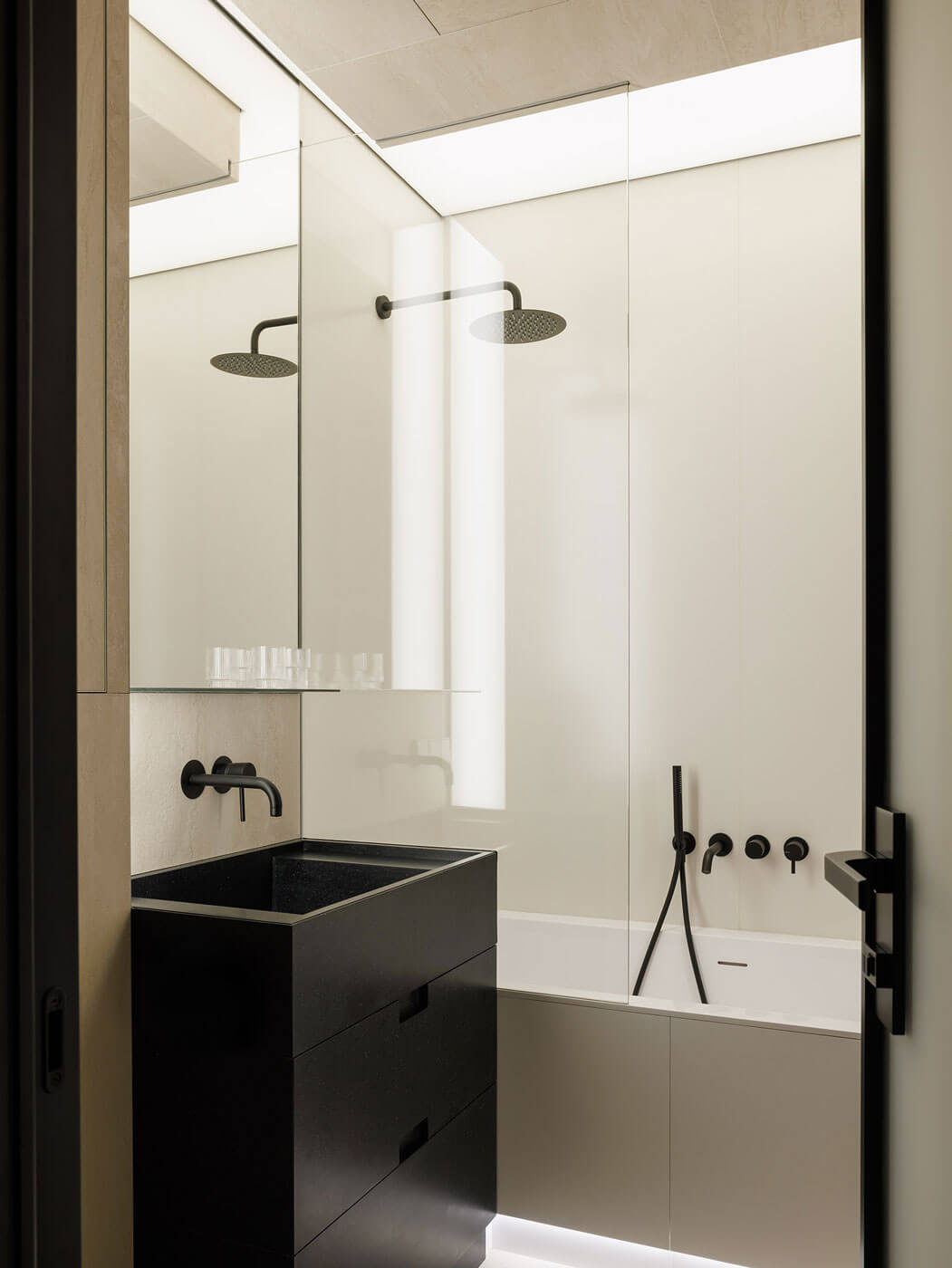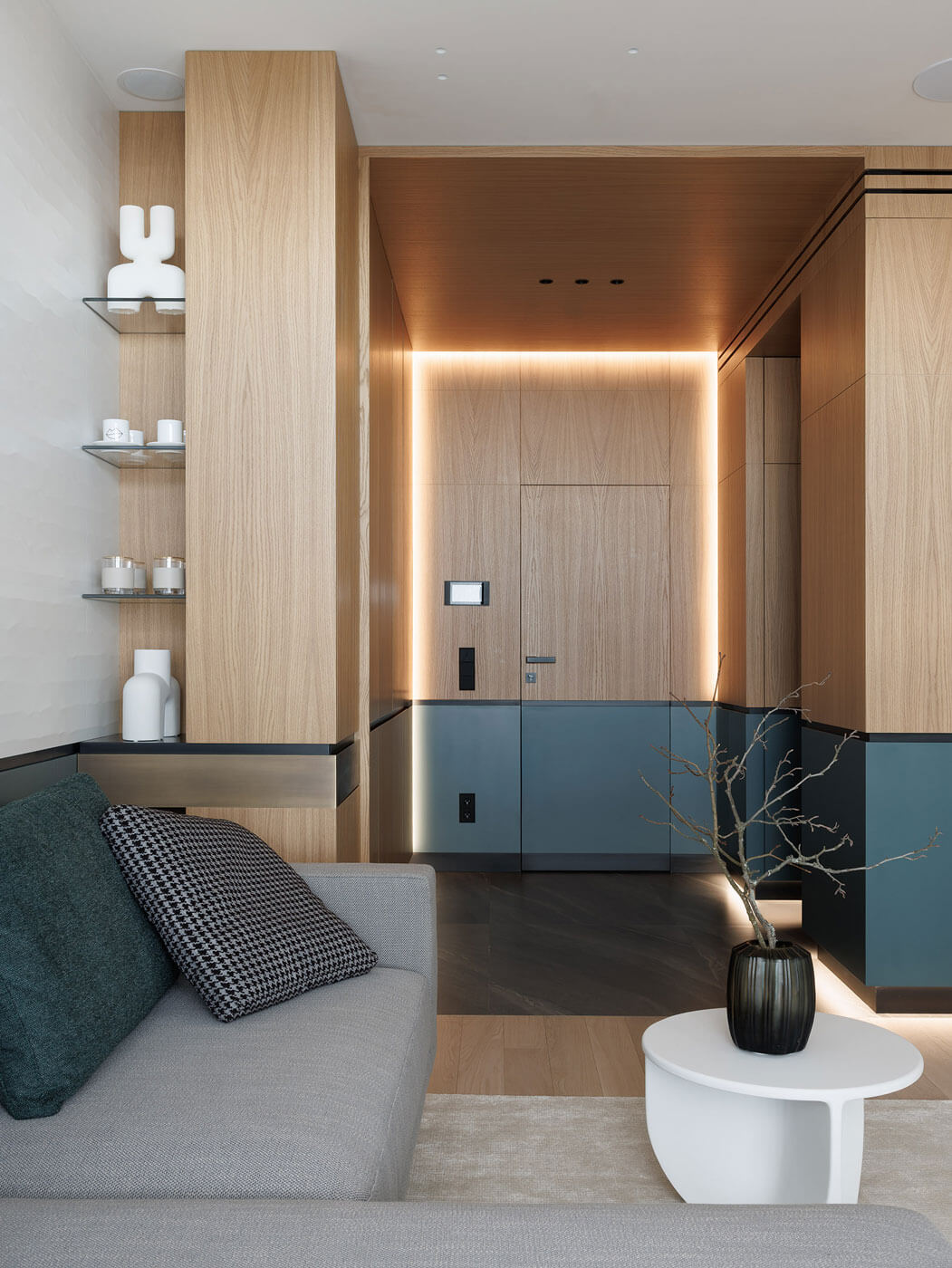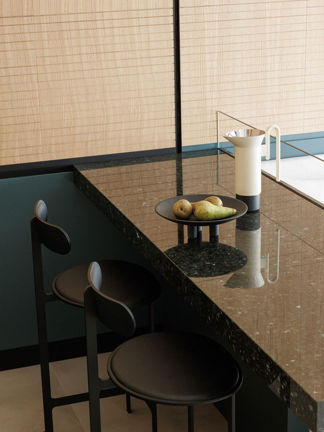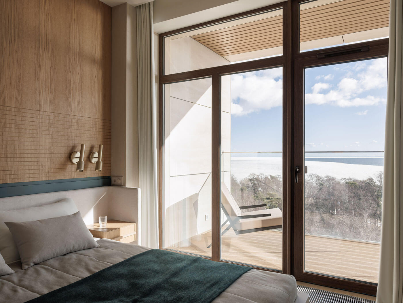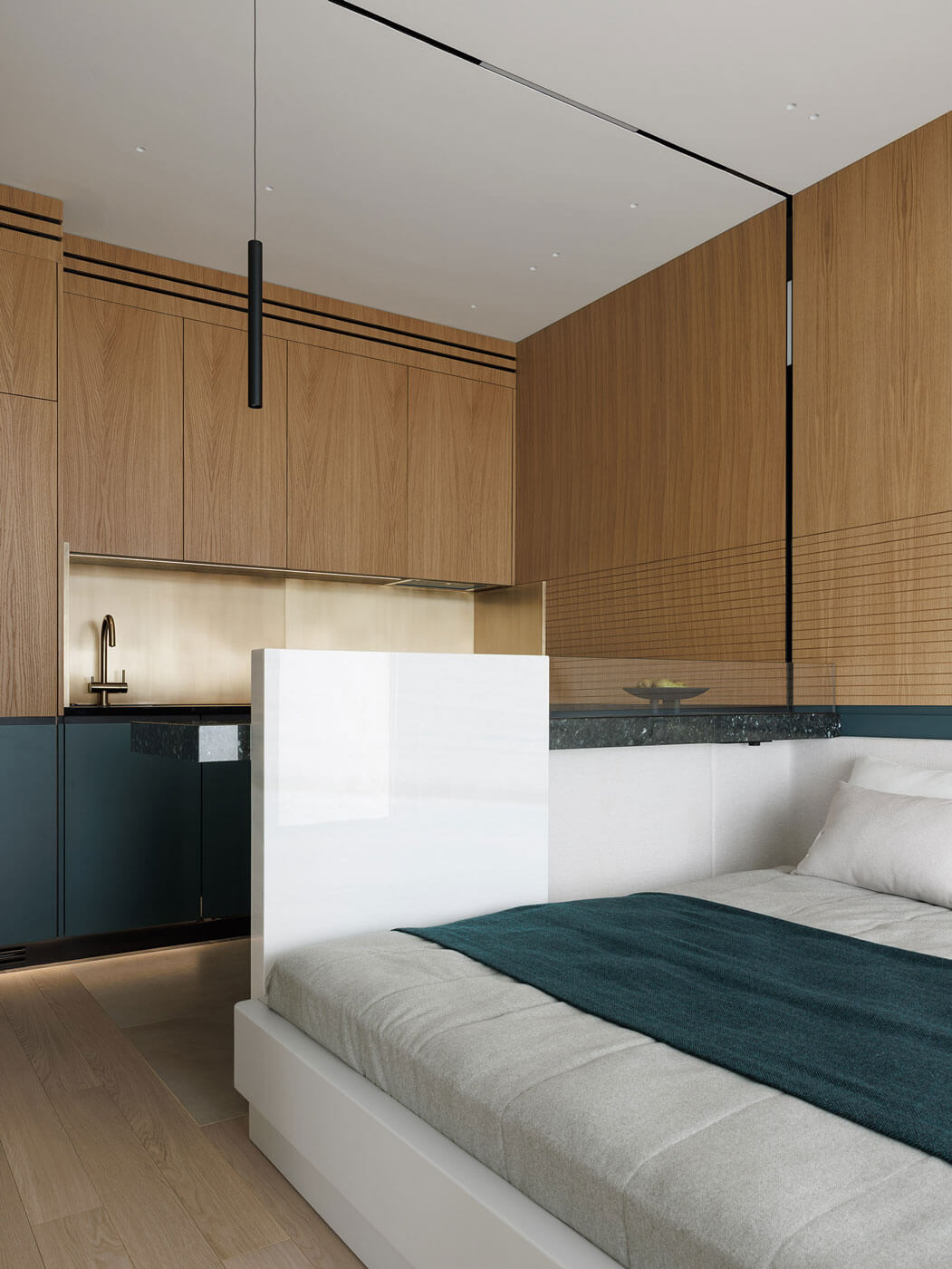 В отделке много золотого дерева и эмали цвета морской волны. Графика черной линии в облицовке панелей вторит линии горизонта и усиливает звучание солнечного дерева.