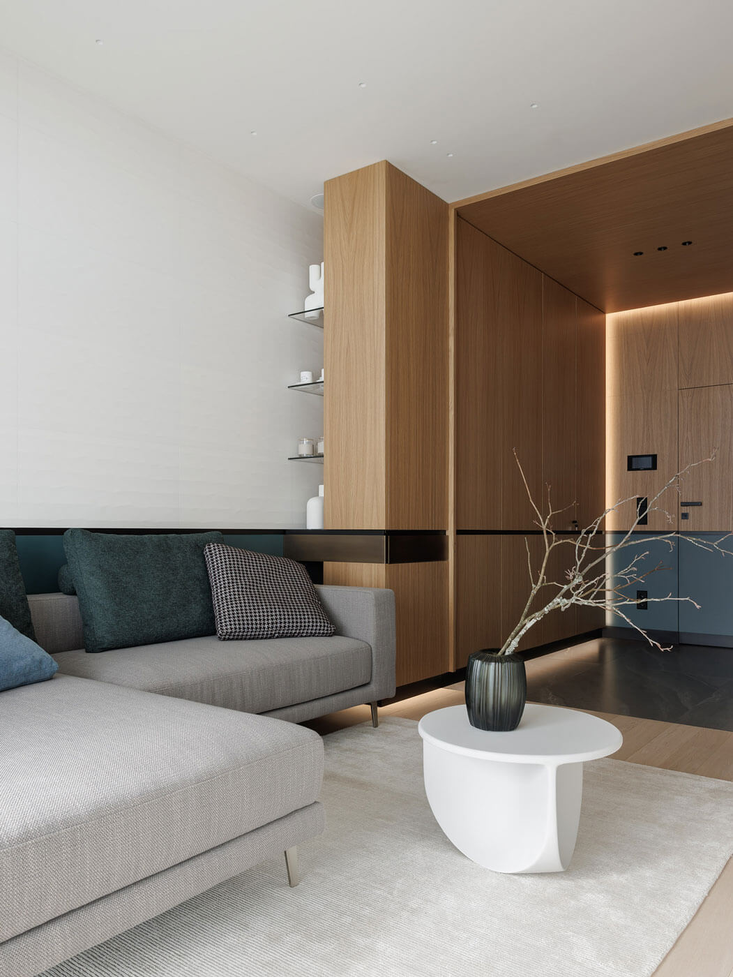 Здесь каждая деталь выверена с ювелирной точностью и функционален каждый см. На площади в 40 м² нам удалось разместить все необходимые элементы и зоны интерьера (прихожая, гостиная, кухня, столовая, спальня, зона кабинета (выдвижной стол). Объемные системы хранения растворены в архитектуре пространства.