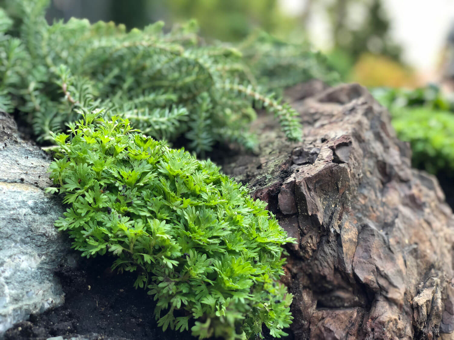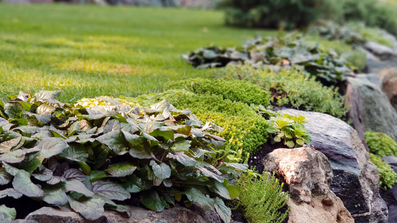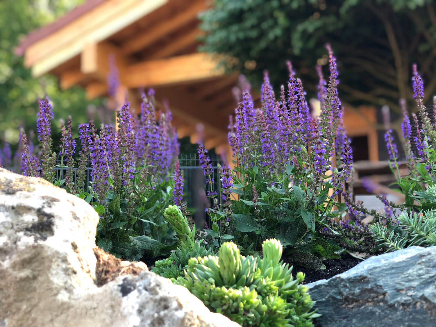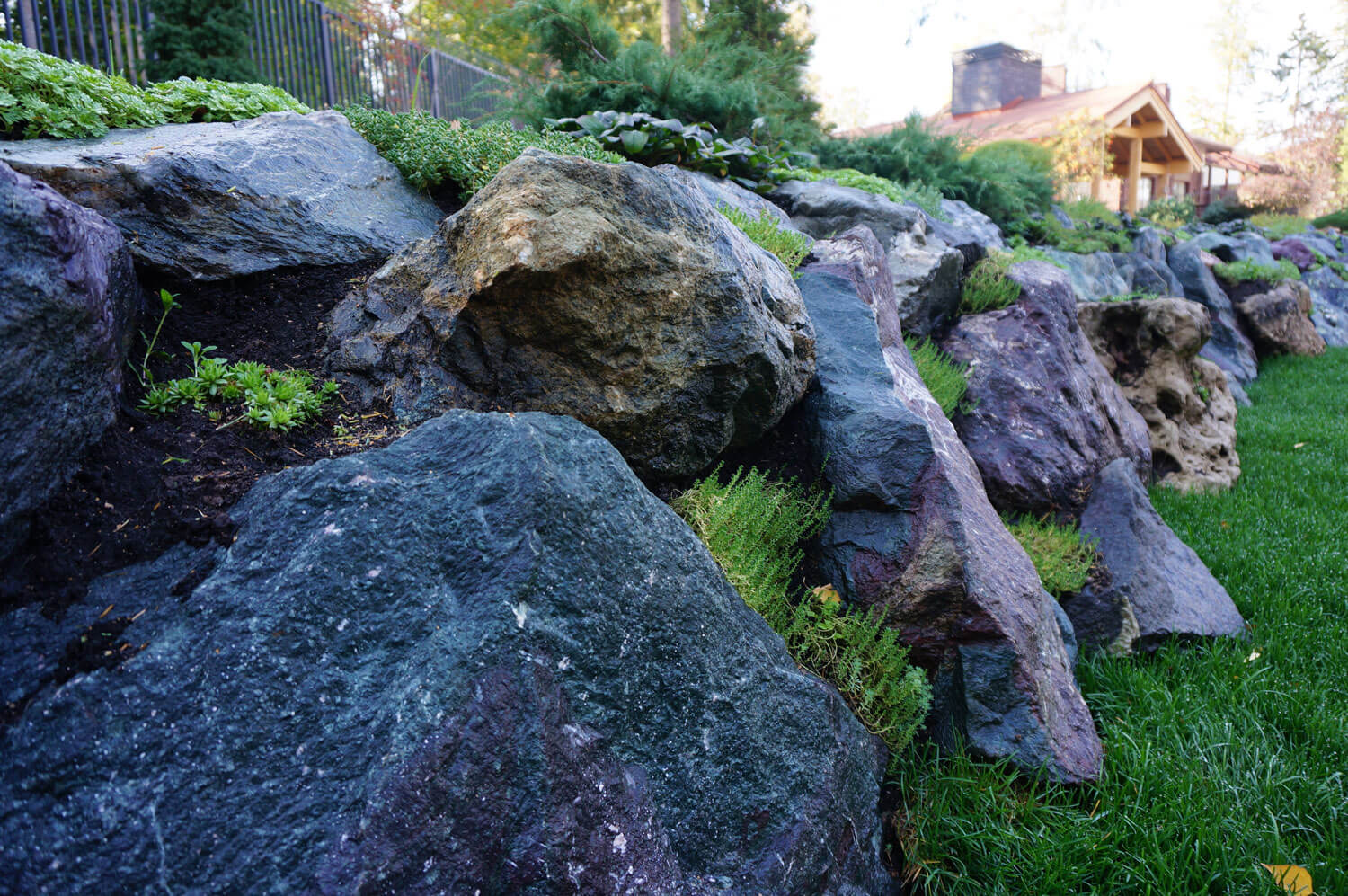 Переход в природную часть обозначают две террасы. Мы ушли от бетонирования и выполнили подпорные стенки в естественном природном стиле, используя большие слэбы из природного камня — уральского габродиабаза. У него интересная фактура, рисунки, цвет, есть и коричневые включения, отвечающие цвету дома, и фиолетовые оттенки. В проставках из эльбруса сделаны посадочные карманы для многолетних почвопокрвных растений: очитков, камнеломок, живучки ползучей, шалфея, красивые крупные куртины которых будут цвести с ранней весны до поздней осени.