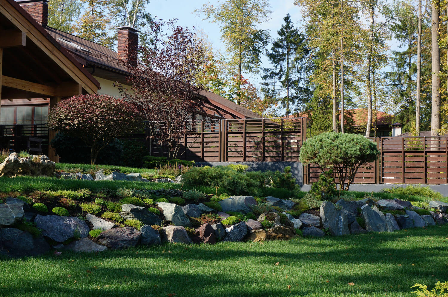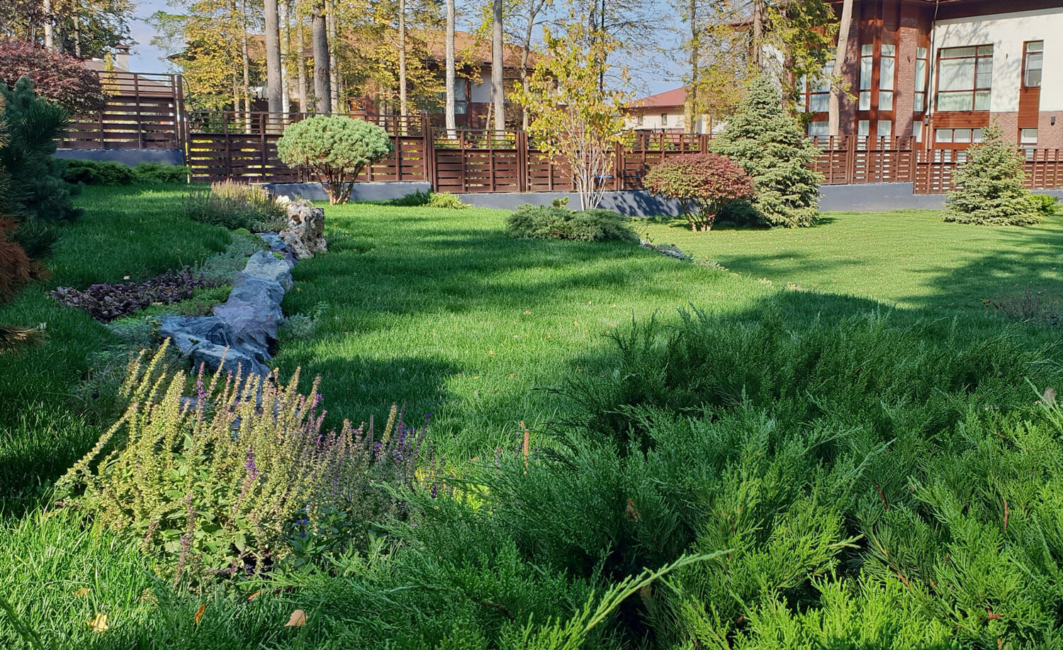 Еще три года назад на месте сада была строительная площадка. Позади колоссальные работы — 400 м3 непригодной земли заменены на плодородный грунт, спроектированы и устроены дренажная система для участка с тяжелыми глинами, системы фасадного и ландшафтного освещения, система автополива, газон, проведены масштабные посадки.