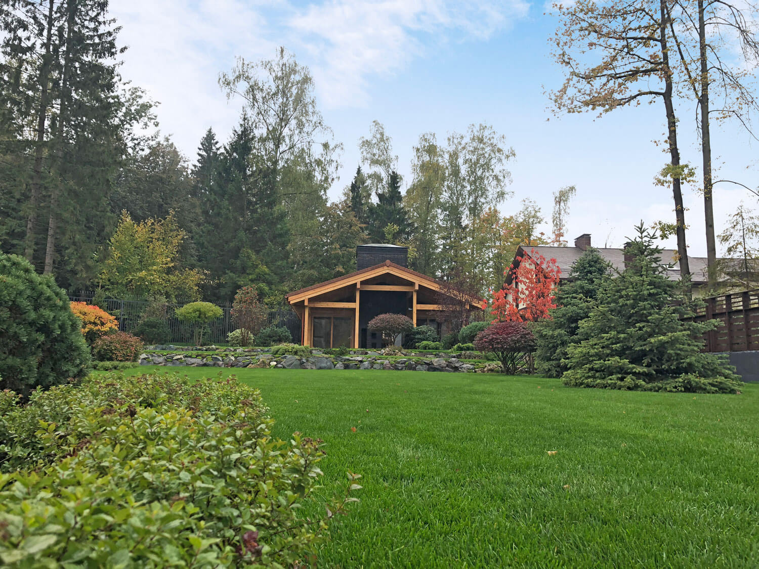 Беседка площадью 110 м2 построена из клееного бруса, крыша — из черепицы, в стиле дома. Средняя температура в ней в любое время года 24–25 С, комфортное состояние поддерживается благодаря универсальной шведской плите. Оригинальный элемент павильона — конструкция с двумя функциями: в помещении это камин, а снаружи — печь-барбекю. В теплое время года площадь беседки можно увеличить за счет открытой террасы, просто раздвинув двери. Отсюда прекрасный вид на массив рододендронов.
