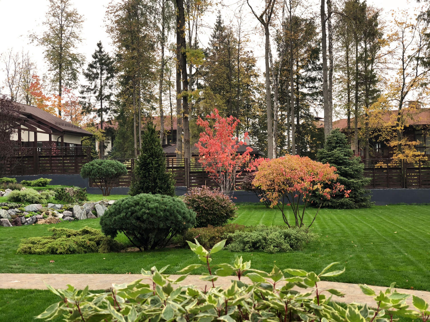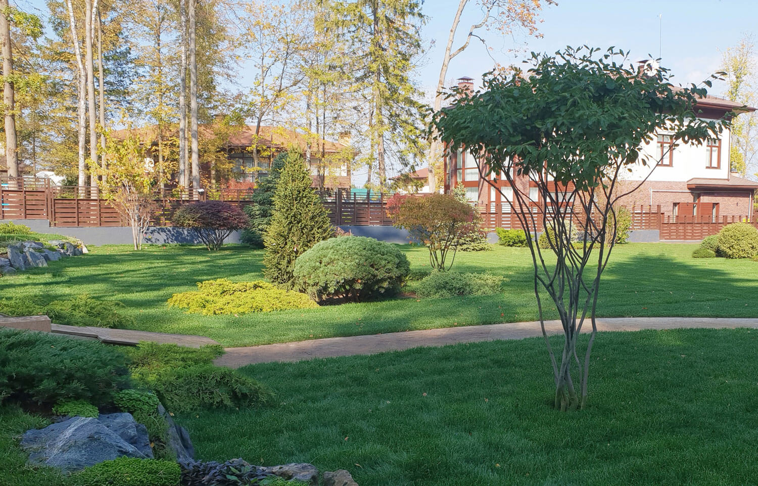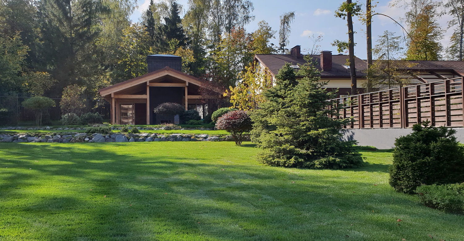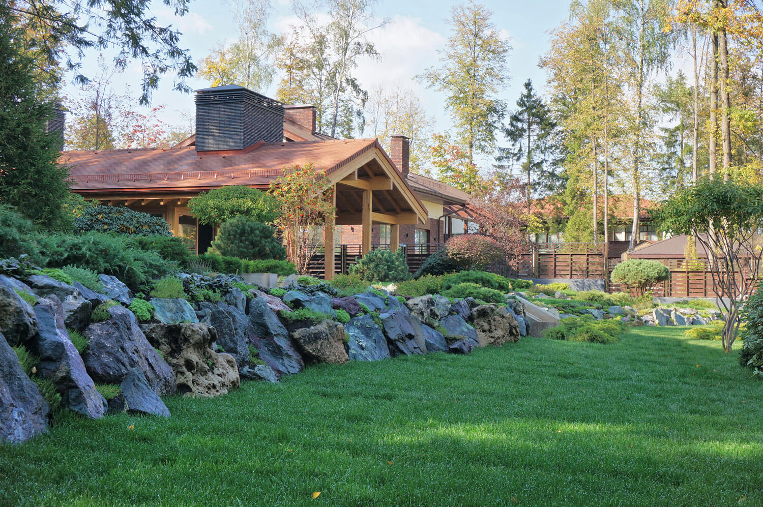 «В проекте многое продиктовано классической архитектурой дома с карнизами, рустами. Он слишком объемный для данного пространства, и мы думали, как соединить такой большой объект с существующей лесной зоной. Появилась идея перетекания одной зоны в другую — постепенно сад из регулярного и строгого плавно переходит в природный, пейзажный и сливается с лесом. Мы максимально сохранили существующую природную часть, гармонично дополнив ее естественными видами растений.