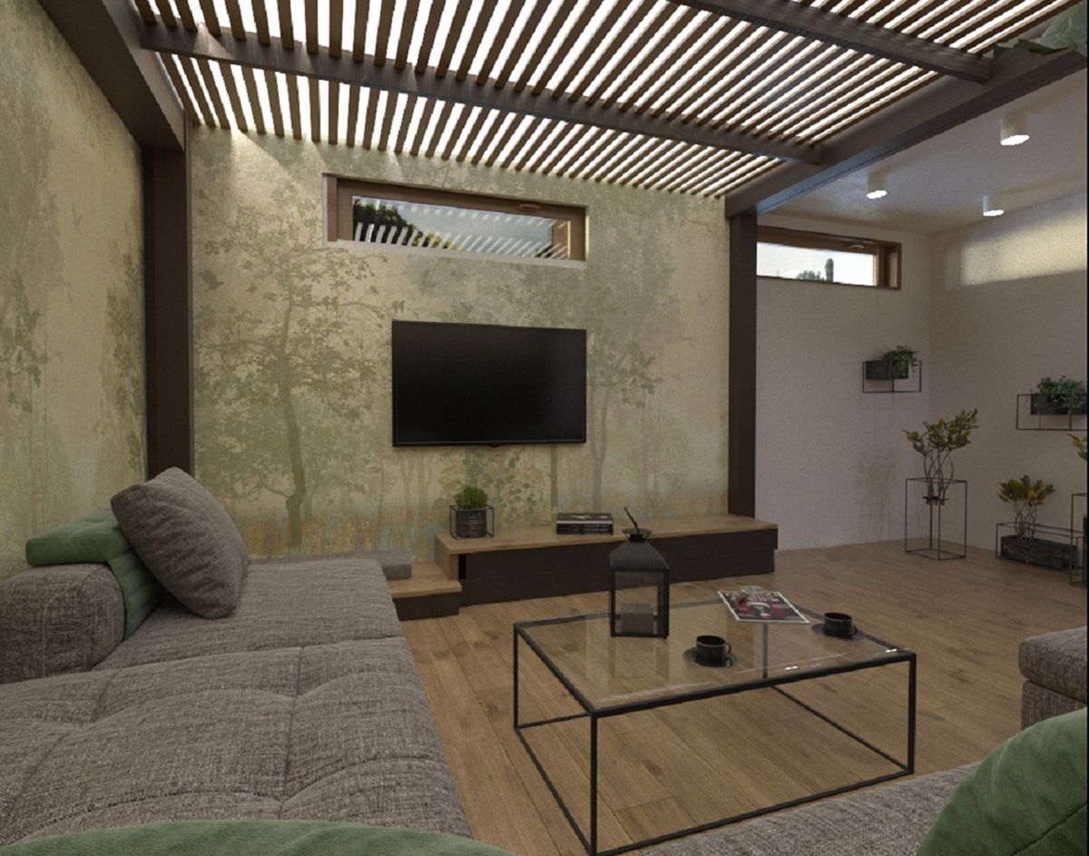 В комнате отдыха шикарный диван с глубокой сидушкой с фактурой льна насыщенных серых оттенков, которые подчеркивают колорит фрески сложных дымчатых зеленых тонов. Реечный потолок со скрытой диодной подсветкой создает настроение открытой террасы.