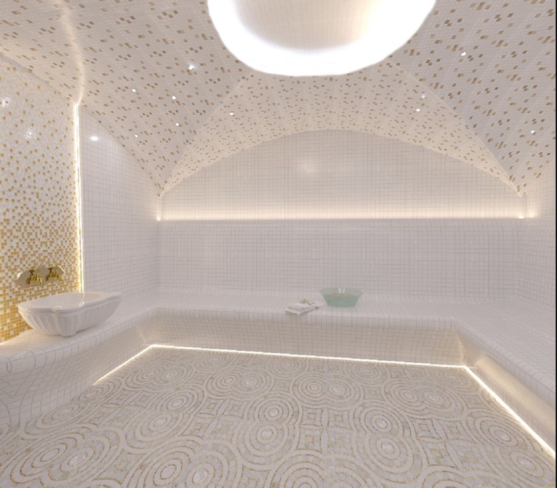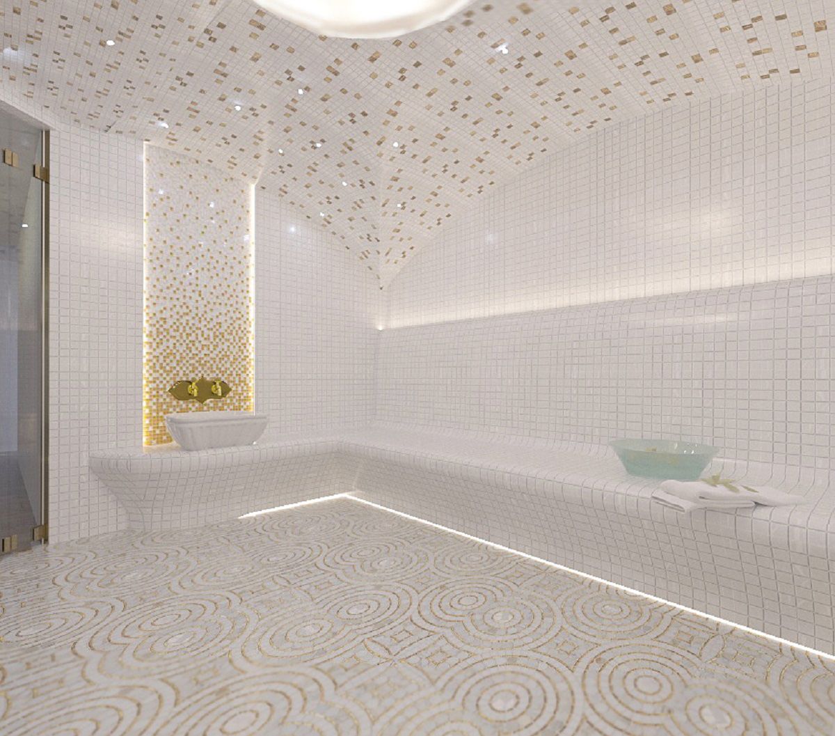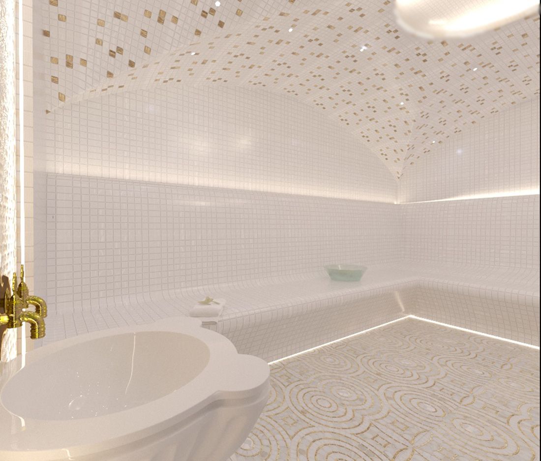 Хаммам выполнен из стеклянной мозаики в нетрадиционных бело-золотых цветах, при этом акцент размещен на потолке, в виде купольной части с круглой нишей с диодной подсветкой, имитирующей свет луны.