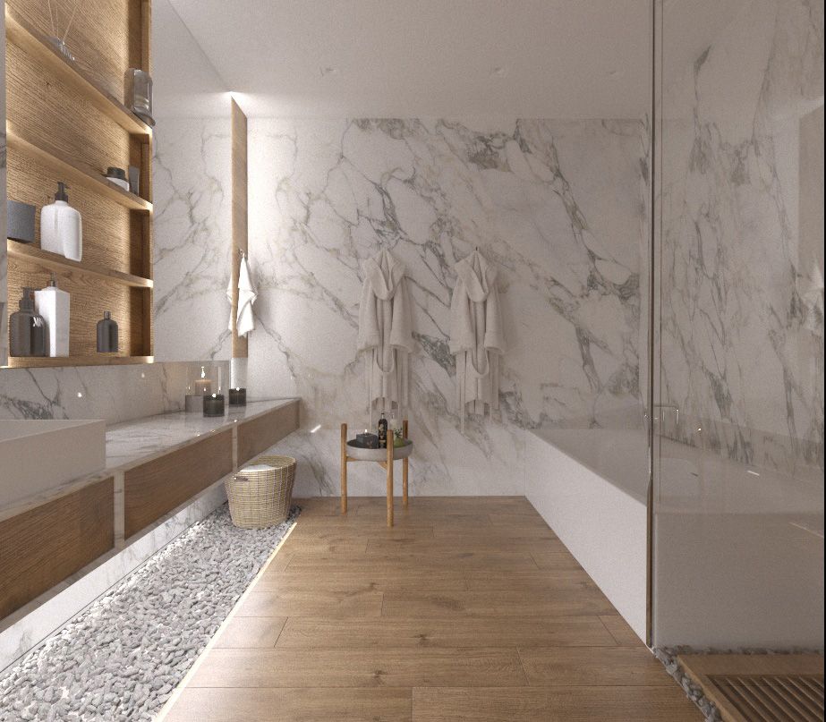 Цветовое и орнаментальное решение подается как современное прочтение хаммамов. Двери стеклянные, распашные. Рядом с хаммамом помывочное отделение в современном стиле: традиционные для хаммама светлые породы мрамора обыграны в широкоформатной мраморной плитке, которой облицованы стены.