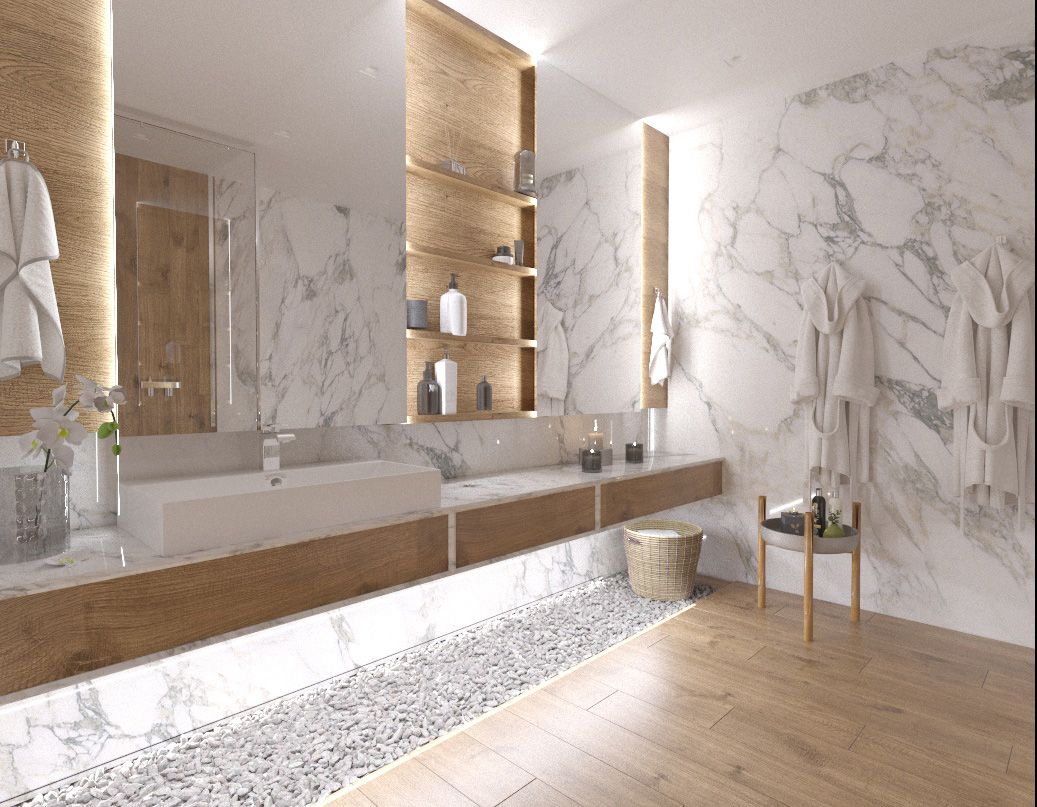 Крупноформатная мраморная крошка и нижняя диодная подсветка создают особый настрой на спа-процедуры. Под раковиной и за зеркалами есть полочки для кремов и масок для спа.