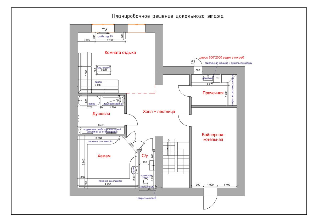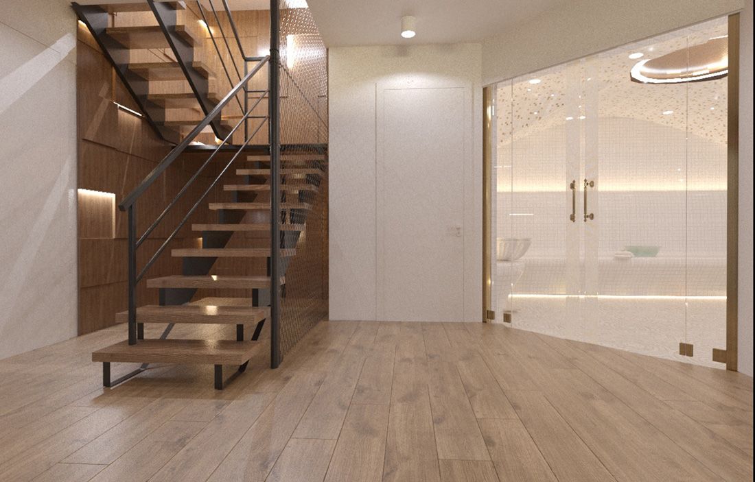 Спа-зона спроектирована в цокольном этаже дома с маленькими, как бойницы, окнами. Главное желание клиента: «не хочу ощущать себя как в подвале». Поэтому все помещения, которые относятся к этой зоне, имеют либо большие фрески с изображением природы, либо различные световые сценарии, создающие расслабляющее настроение и ощущение дневного света.