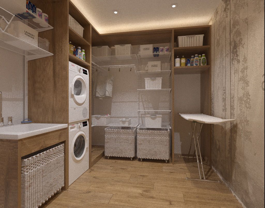 Хозяйственное помещение не имеет окон, но фреска с пейзажным мотивом, выполненная на стене, зрительно увеличивает пространство.