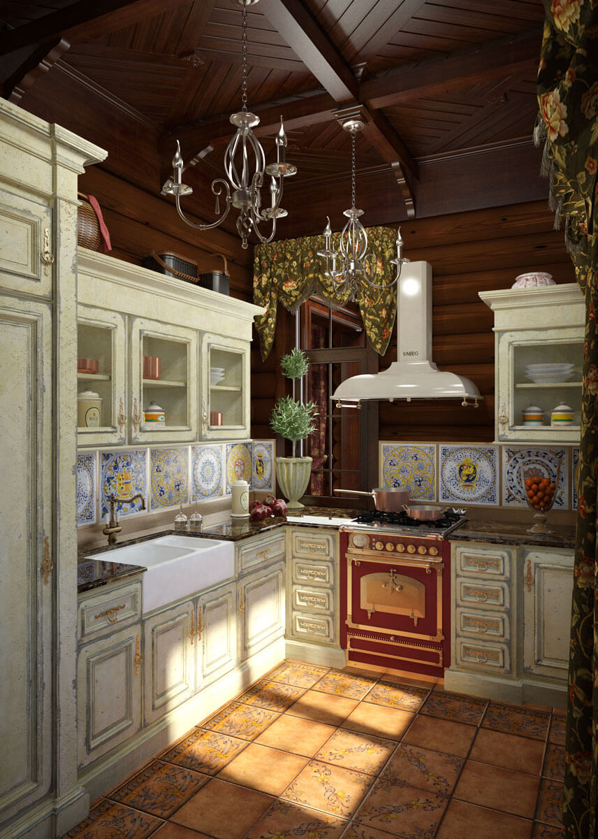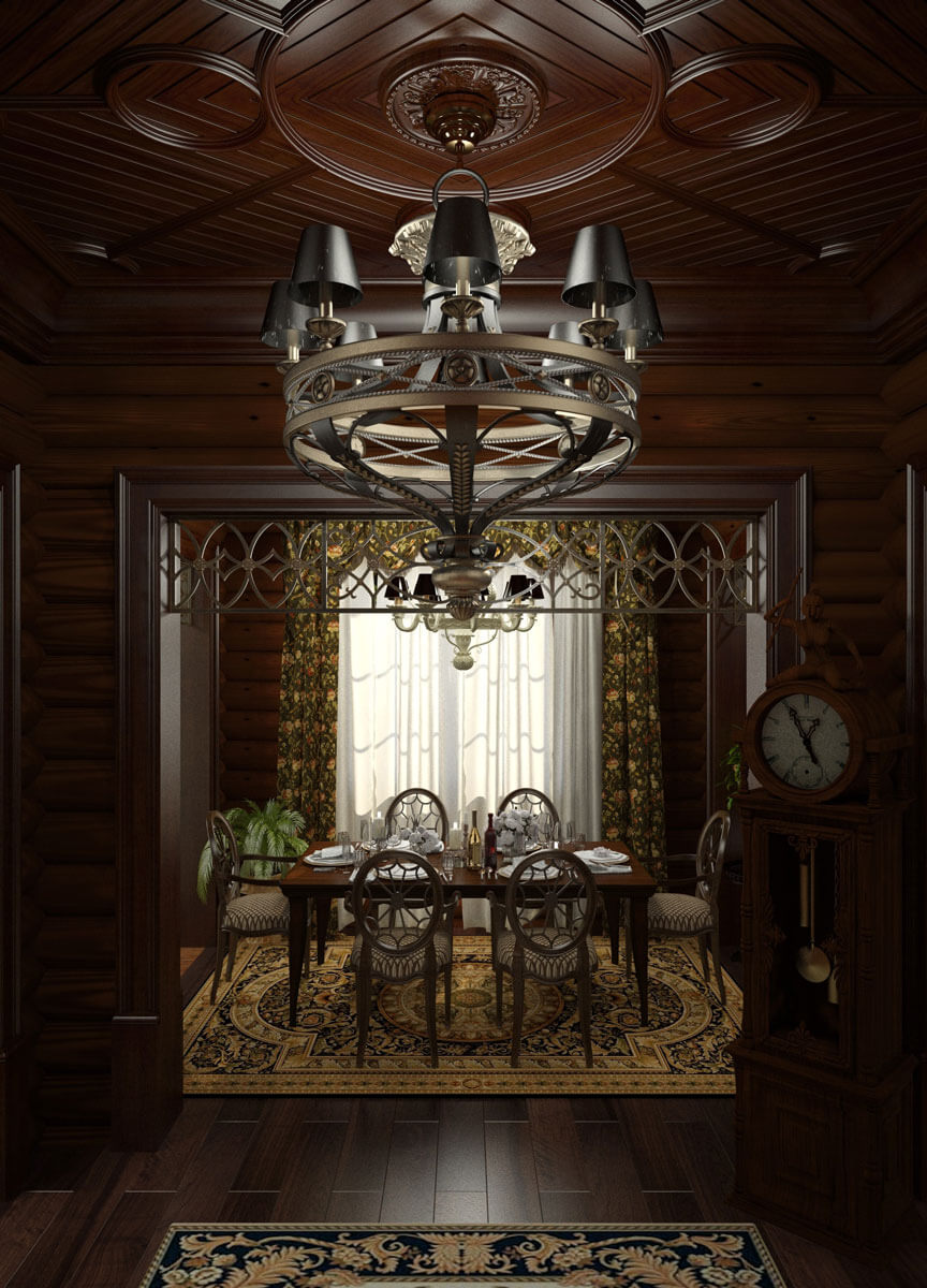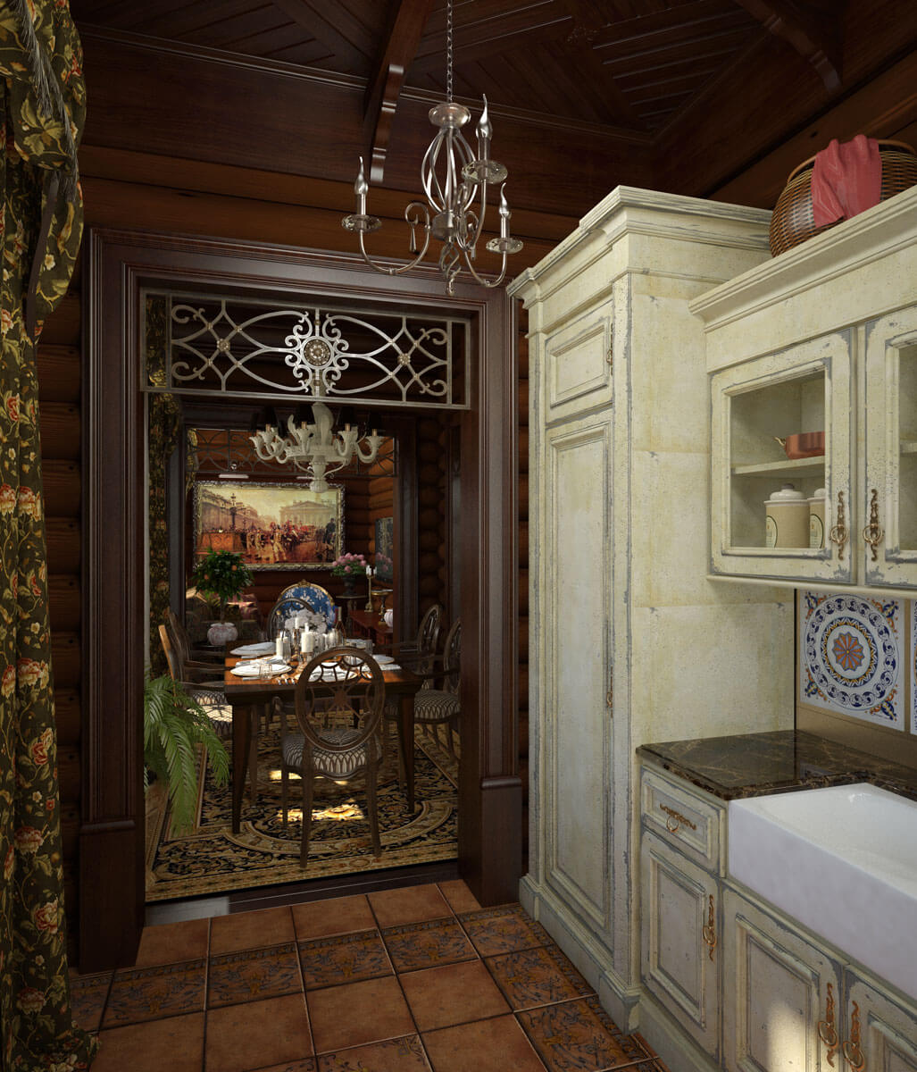 Пространство кухни, отделено от пространства столовой и гостиной прямоугольной аркой с кованным элементом. Доминирующим цветом кухни — стал сложны состаренный молочный цвет, в отличие от гостиной и столовой, где царствует зеленый. Объединяют эти три пространства тонированные бревна сосны. Обилие текстиля — занавески, кружевные салфетки, шелковый ковер с цветочным узором – создают атмосферу покоя и тишины, уюта и мягкости. Общее настроение создает не только многообразие цвета в мебели и текстиля, но и сложная архитектура потолка. Освещение первого этажа, учитывая его высоту, тщательно продумано. Потолки оформлены деревянными балками, геометрический рисунок которых в каждом помещении разный. Большая кованная люстра, точечные светильники, вмонтированные в псевдобалки, бра и люстры — фонари, освещающие парадную часть дома, - все эти элементы работают то вместе, то порознь и создают своеобразную световую и стилистическую игру, в которой современные достижения и традиционные представления не противостоят, а как бы дополняют друг друга, усиливая проявление их лучших качеств.