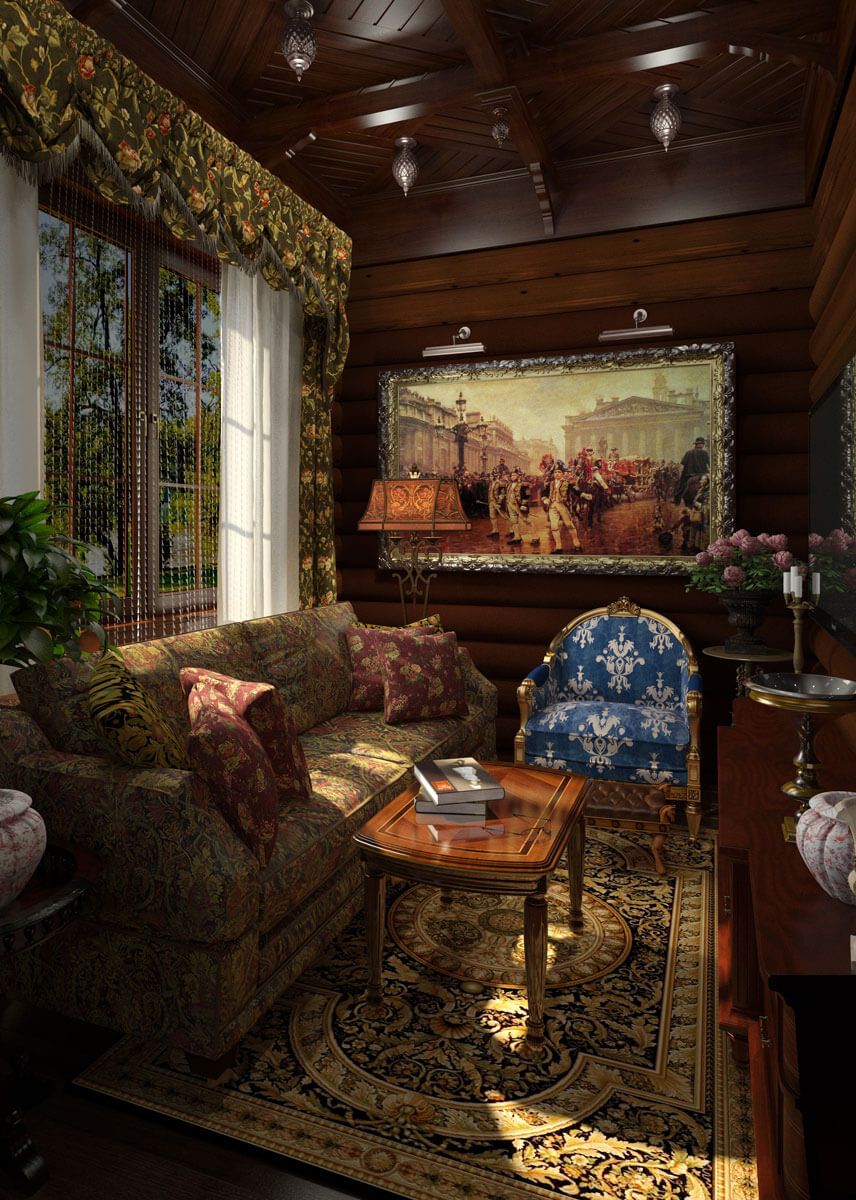 Интерьер гостиной, который успокаивает и расслабляет, подбирался с учетом пожеланий комфорта: тканевый диван и кресло, различных зеленых, терракотовых, синих оттенков – в тон подобранный текстиль окон, тонированная древесина стен, а также пол, выложенный доской американского ореха – основа, в которой раскрываются все элементы декора.
