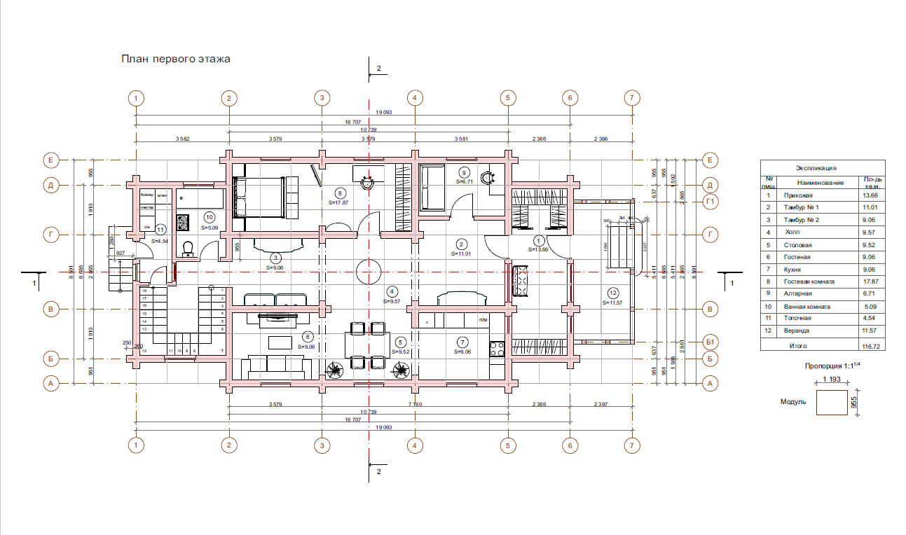 Первому этажу отведено место общественной зоны, второму — приватной. Первый этаж представляет собой перетекающее пространство, объединяющее зоны холла, гостиной, столовой и кухни, переходы между которыми очерчены прямоугольными арками.