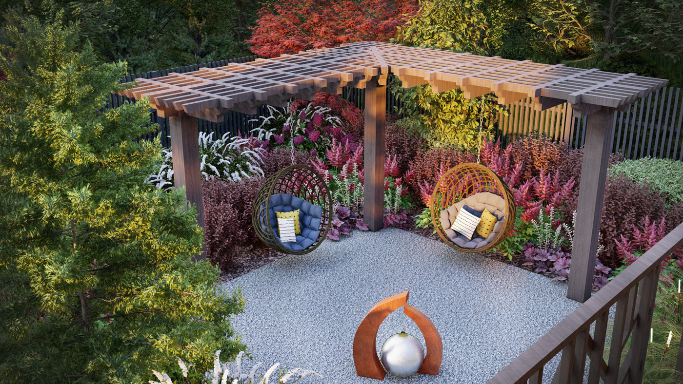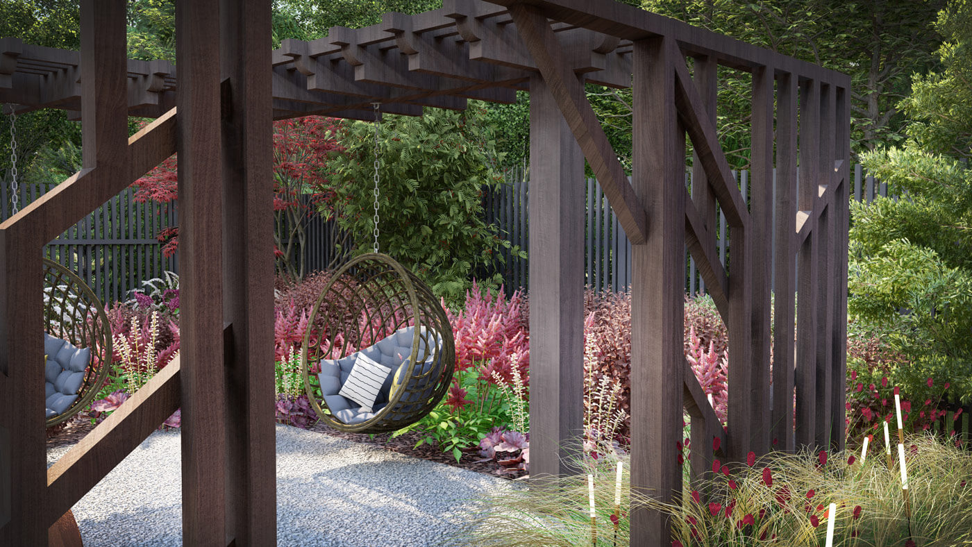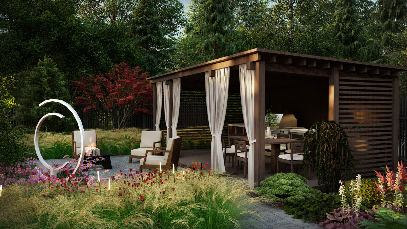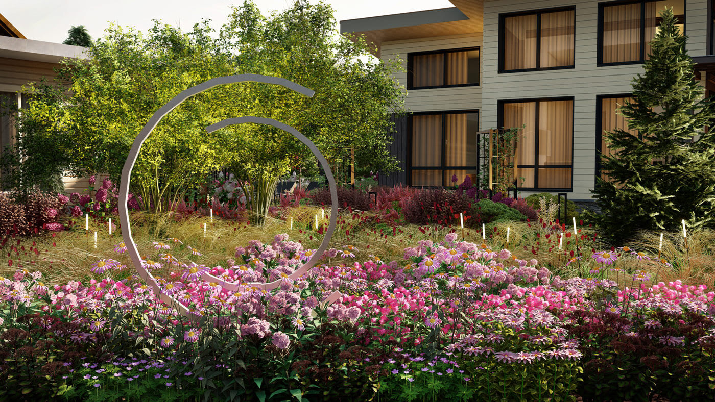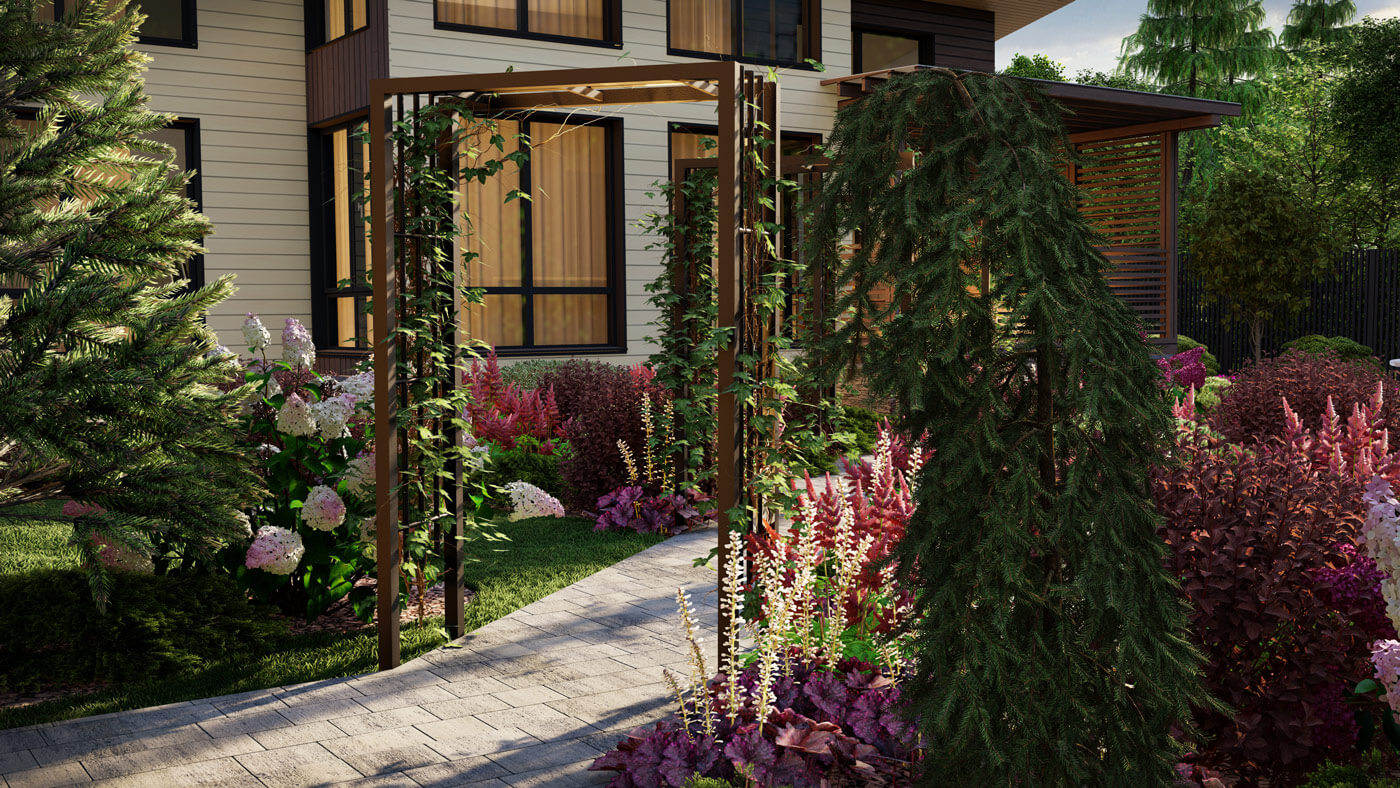 При выборе растений необходимо было отталкиваться от общего образа сада. Главным и преобладающим цветом является Viva magenta. Вишнево-гранатовые оттенки прослеживаются в миксбордерах, очертания которых проходят через весь участок. Здесь были использованы пузыреплодники, астильбы, гейхеры, краснокорые дерены, рябины, кровохлебки и другие декоративные растения в красной гамме. В противовес ярким, дерзким краскам идут малиновые, сиреневые оттенки многолетних культур.