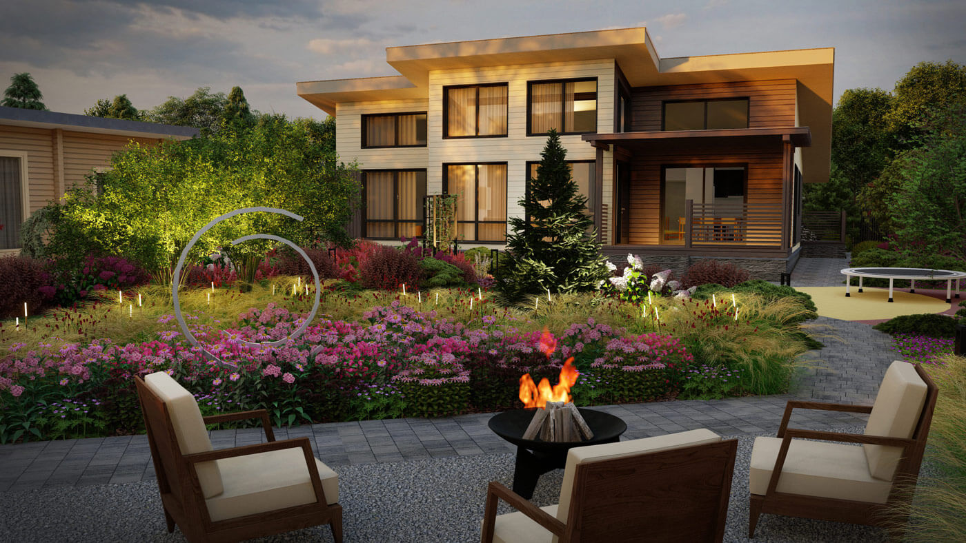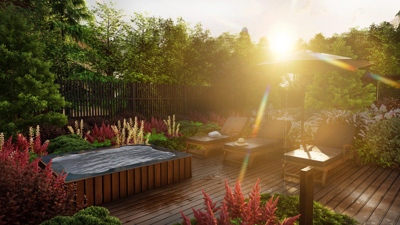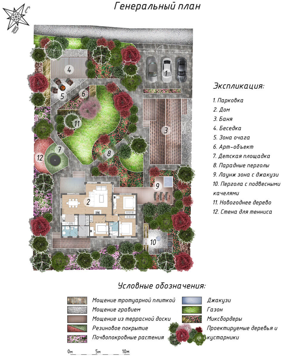 Дорожно-тропиночная сеть в проекте основана на прямых линиях, сквозь которые плавно протекают миксбордеры. Участок поделен на различные функциональные зоны. Всего на 12 сотках смогли расположиться: зона тихого отдыха в виде перголы с качелями, лаунж зона с джакузи, детская площадка, а также беседка, недалеко от которой находится очаг.