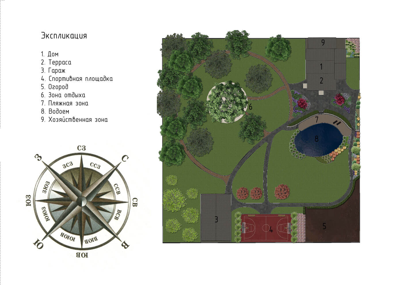 В данном проекте предложен вариант зонирования частной территории на следующие зоны: входная, хозяйственная, пляжная, зона водоема, зона отдыха, спортивная площадка, зона огорода.