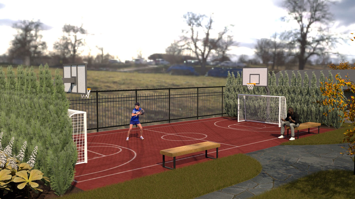 Спортивная площадка изолирована от общей территории плотными рядовыми посадками туи западной. Здесь можно проводить любые массовые игры. Для удобства болельщиков имеются две лавочки.