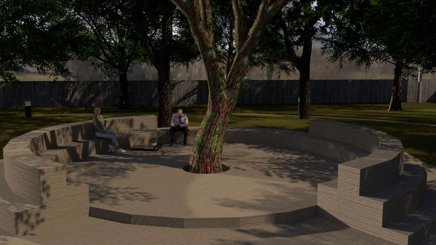 В данном проекте зона отдыха - круглая деревянная терраса, обрамляющая дерево. Сиденья на ней двусторонние – сидеть можно как внутри, так и лицом в сад. Верхняя площадка на спинке лавки может служить столиком для мелких предметов. Основа террасы – металлический каркас, обшитый сосновой доской.