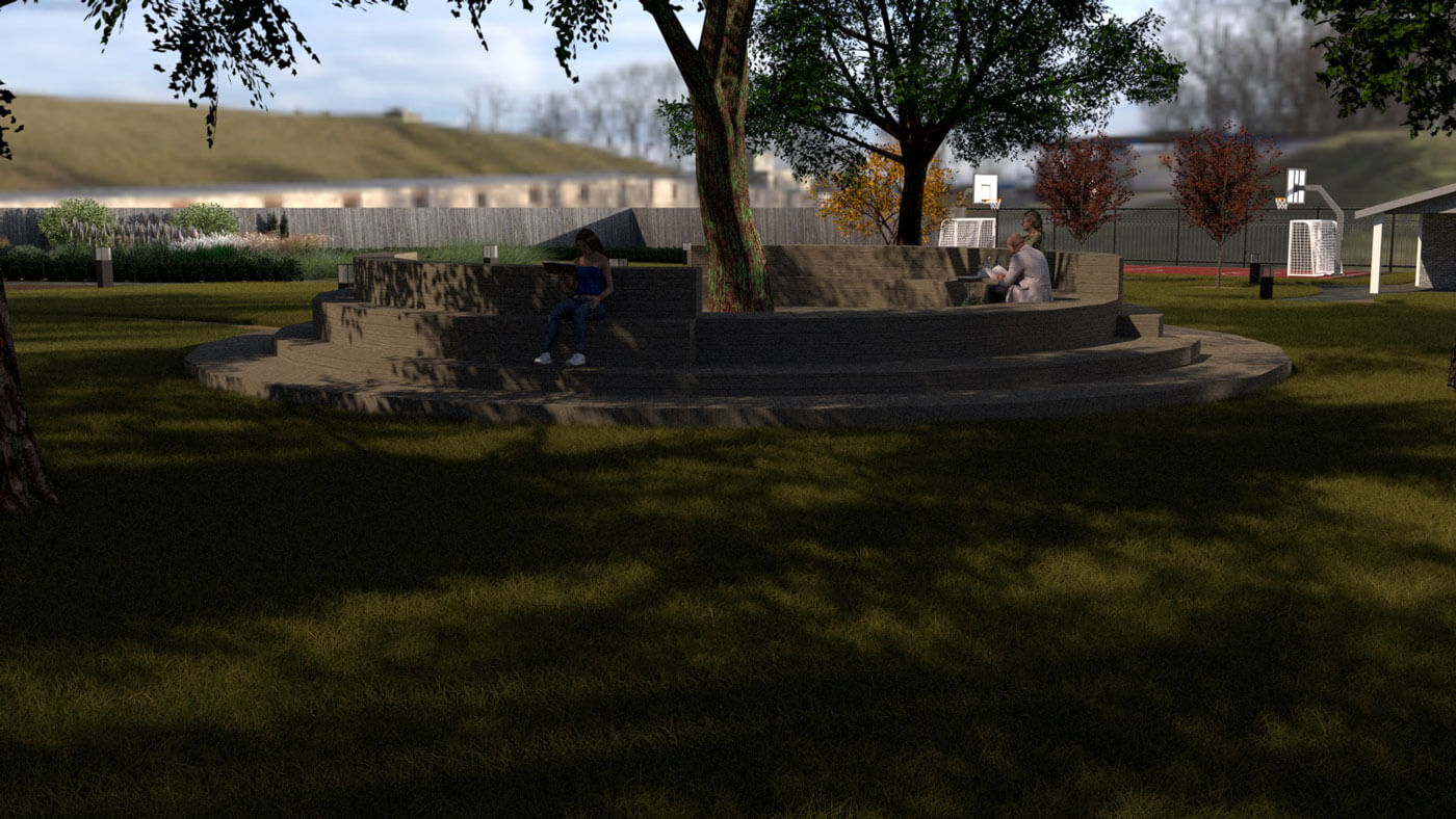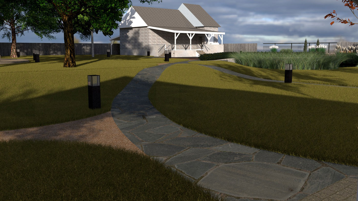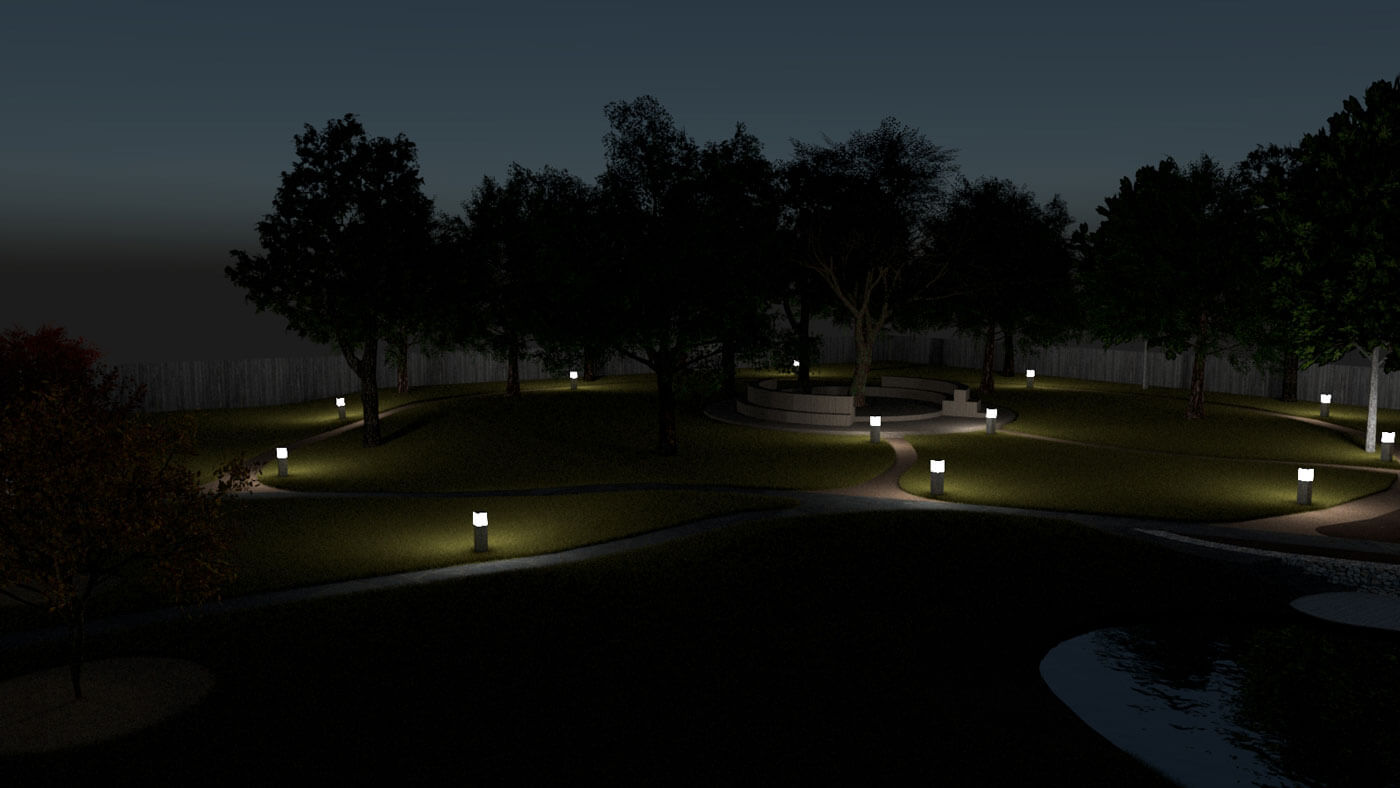 Одним из элементов удобства перемещения является кольцевая прогулочная дорожка в тени деревьев, покрытие - древесная щепа. Прогулочную дорожку подсвечивают стильные светильники прямоугольной формы.