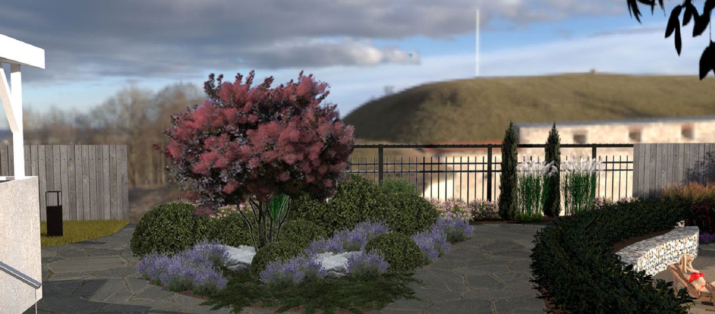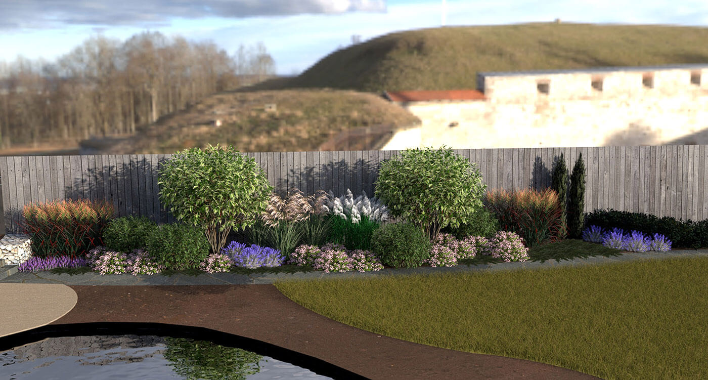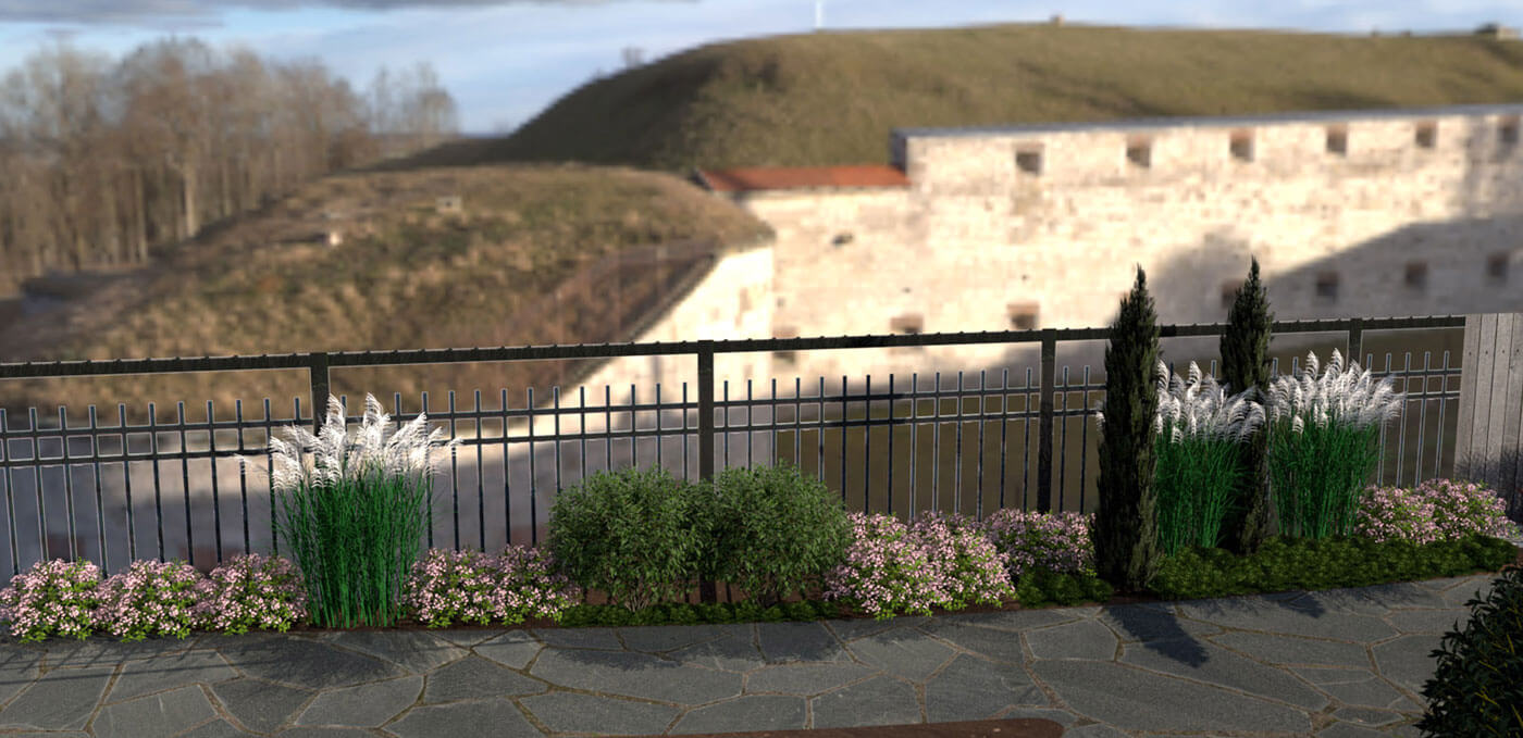 Забор с северо-восточной стороны декорируют два цветника. Первый состоит из спиреи японской, ивы пурпурной, мискантусов, можжевельника скального и тимьяна ползучего. Второй цветник состоит из дерна, котовника, спиреи японской, ивы пурпурной и мискантусов.