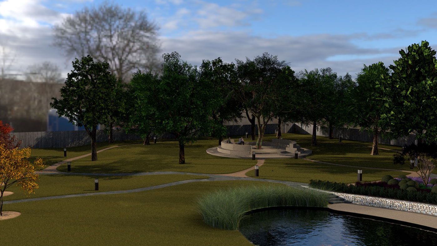 Данный объект озеленения спроектирован в пейзажном стиле. Проект отображает и подчеркивает красоту естественной природы. Характеризуется свободной сеткой плана, извилистыми дорогами, свободными контурами и деревьями с живописными формами крон.