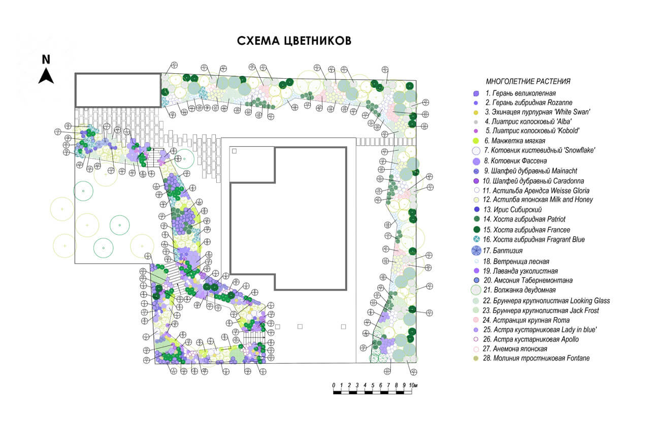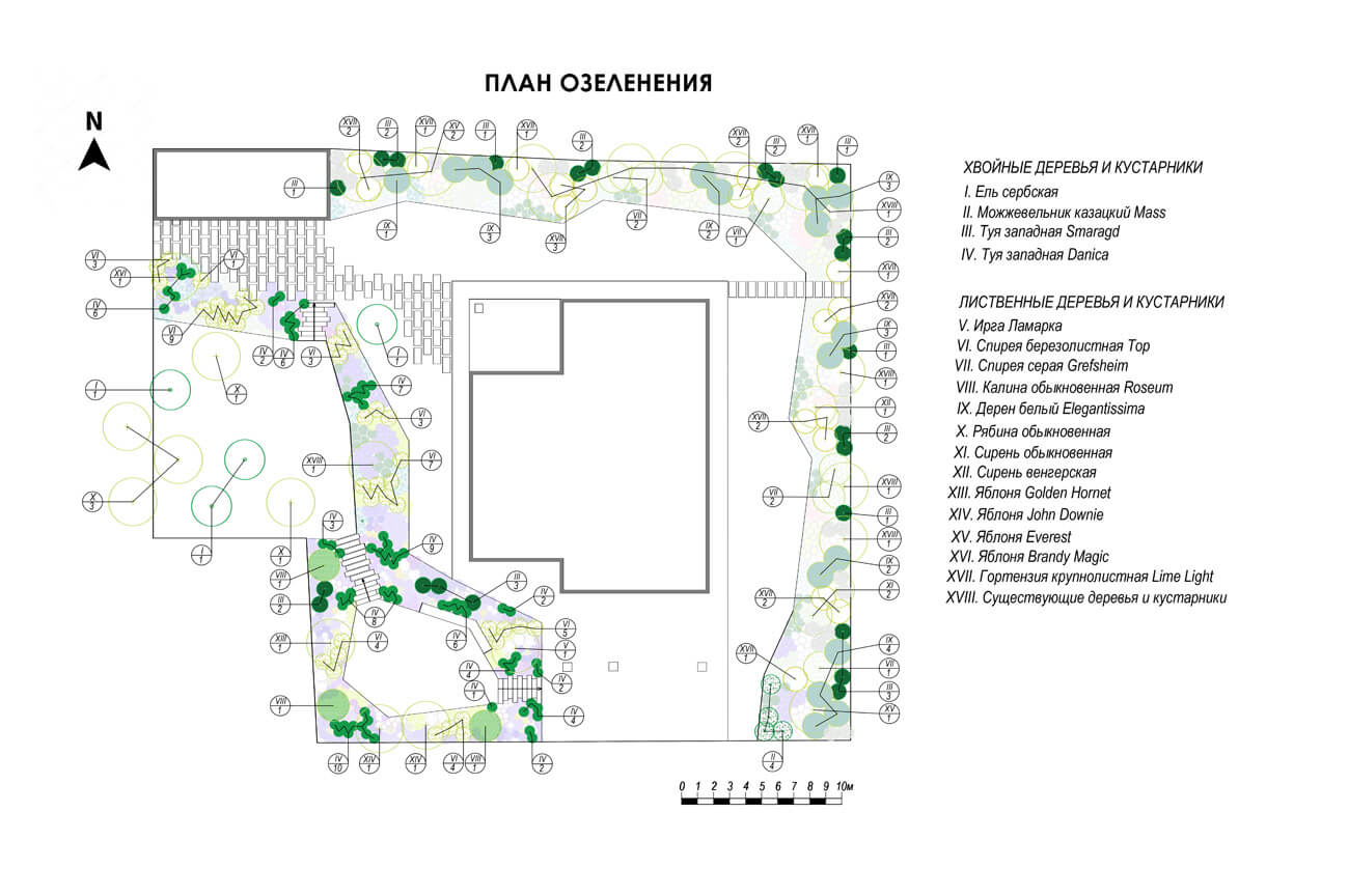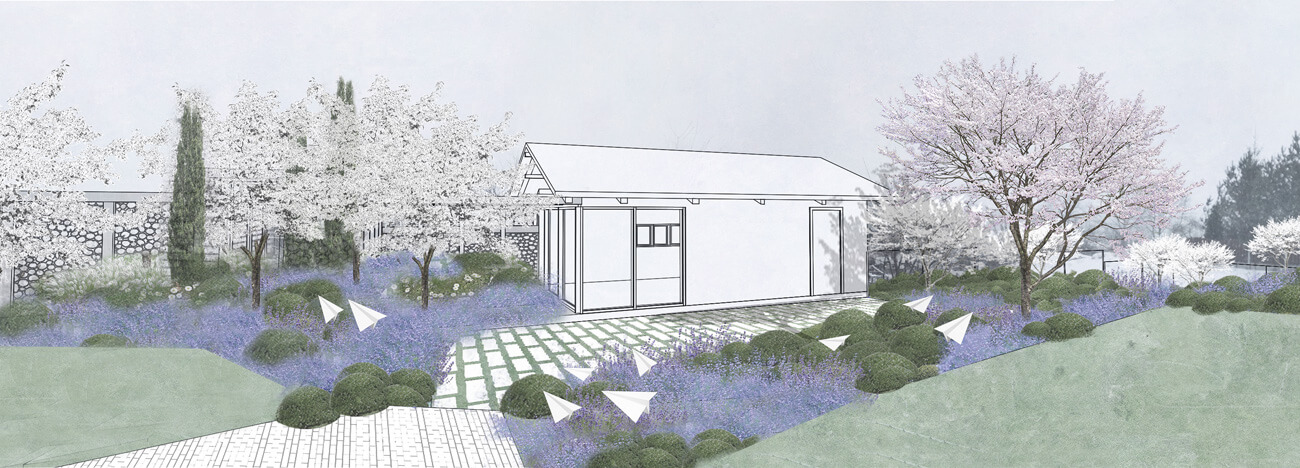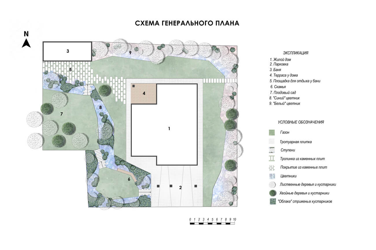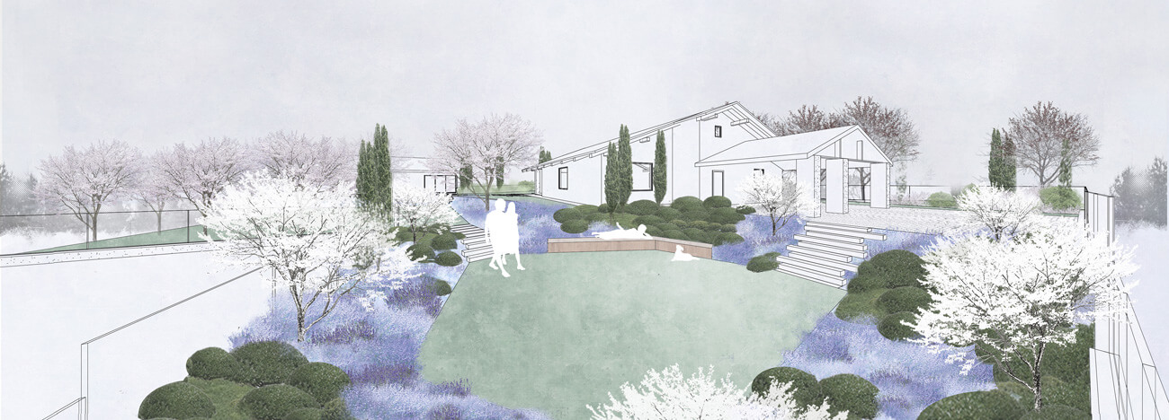Светлый, воздушный и легкий сад для прекрасной семьи пилота и стюардессы, как напоминание о небе, самолетах и об истории их знакомства. В этом саду атмосферно все: облака стриженых кустарников и небесно-голубые цветники на откосах, пушистая «вата» соцветий гортензии, «парящие» ступени, подсветка въездной зоны, как на взлетно-посадочной полосе аэродрома. Изломы линий в планировке и мощении дорожек повторяют изломы в контуре крыла самолета.