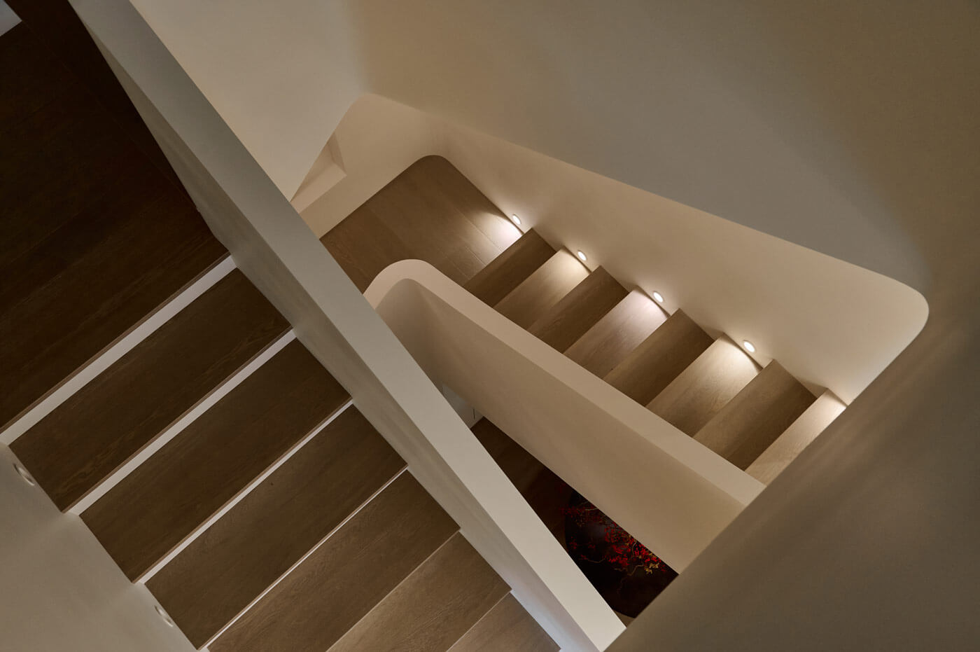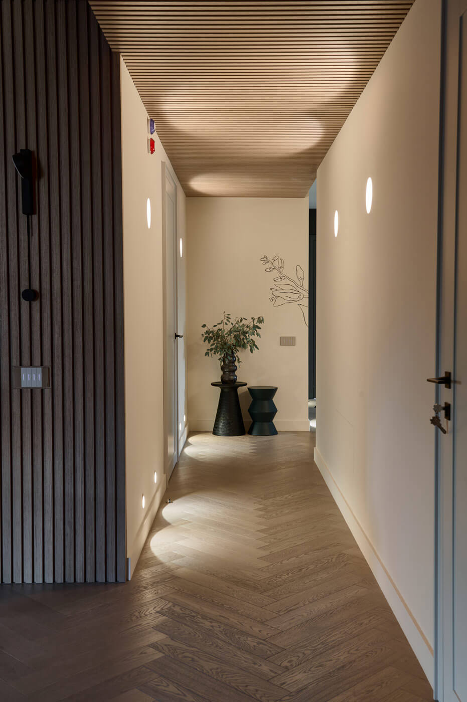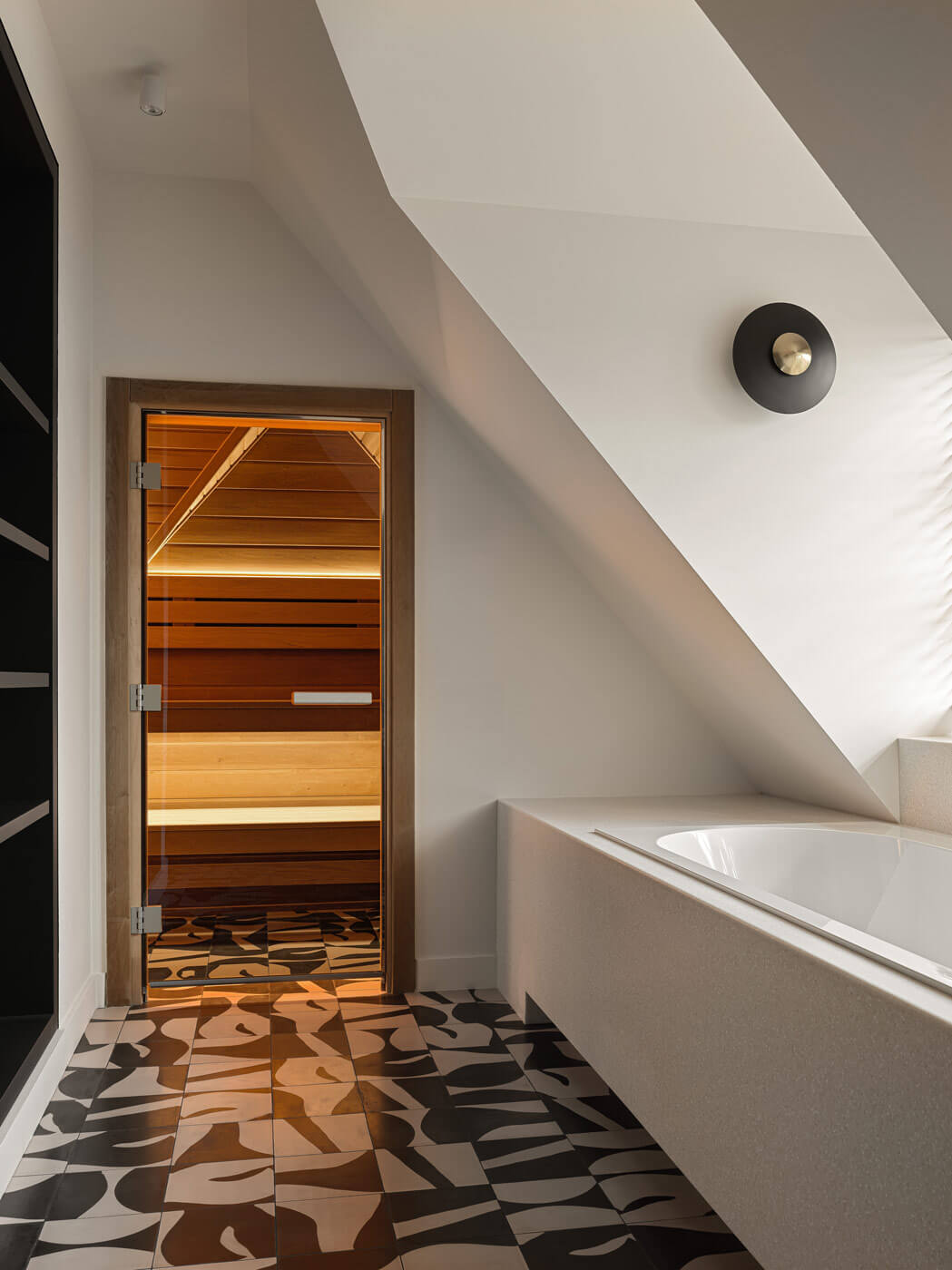 Фигурная лестница, оформленная предметами современного искусства, ведёт на приватный этаж. Здесь расположились: игровая зона для детей, кабинет, гостевая комната, уборная с ванной и инфракрасная сауной и отдельная гордость — спортзал с большим круглым окном для уединения и созерцания природы.