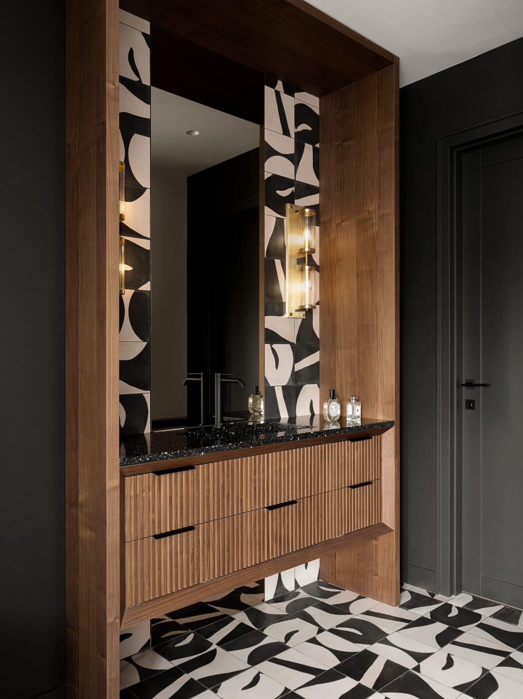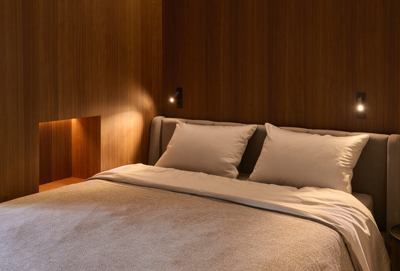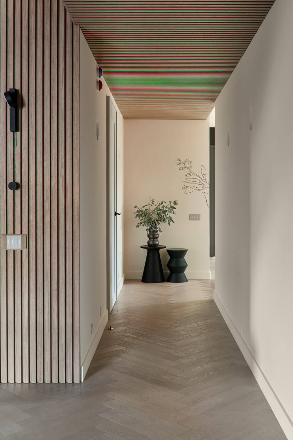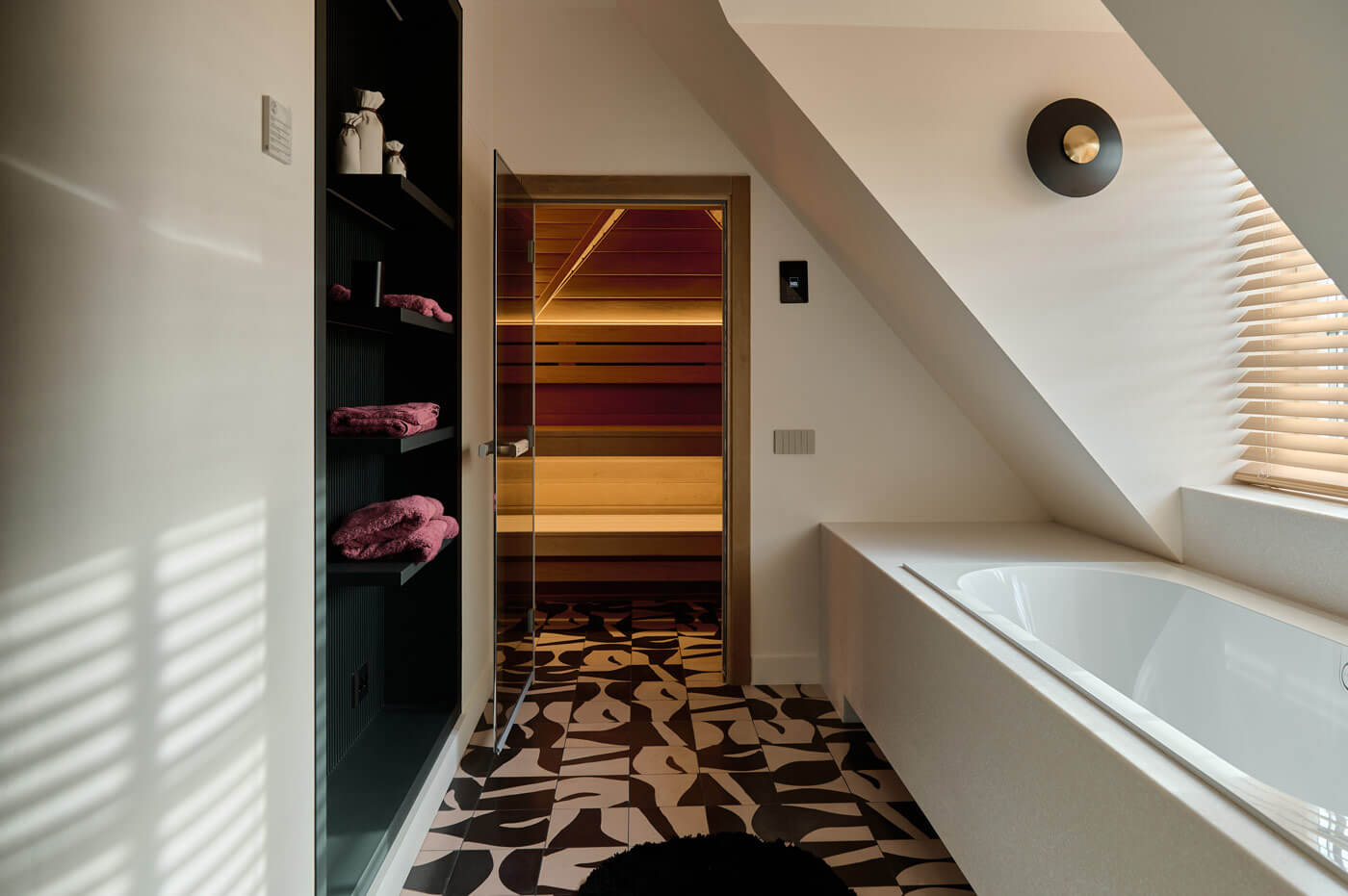 Фигурная лестница, оформленная предметами современного искусства, ведёт на приватный этаж. Здесь расположились: игровая зона для детей, кабинет, гостевая комната, уборная с ванной и инфракрасная сауной и отдельная гордость — спортзал с большим круглым окном для уединения и созерцания природы.