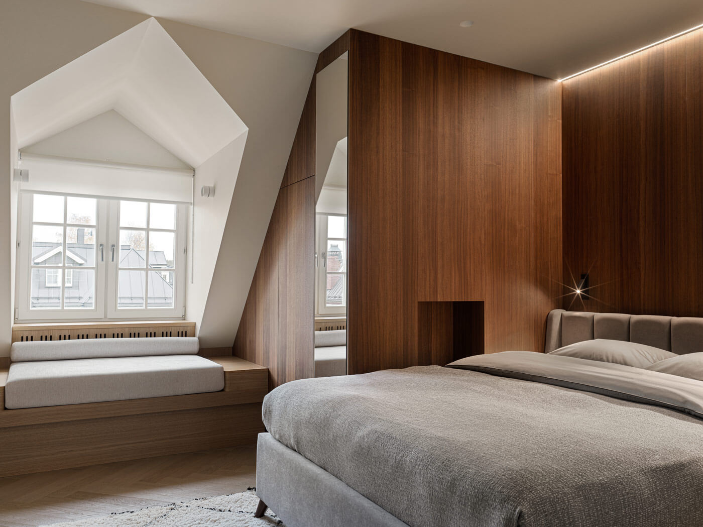 Классические детали в архитектуре — круглое окно мансардного этажа и эркер увеличивают пространство интерьера за счет света.