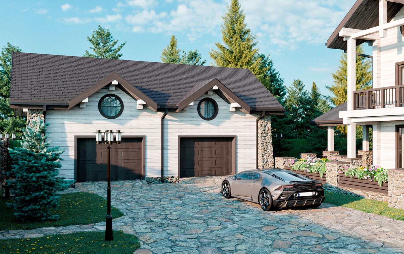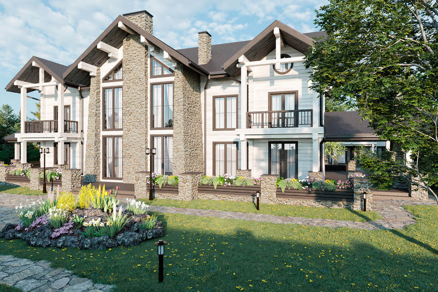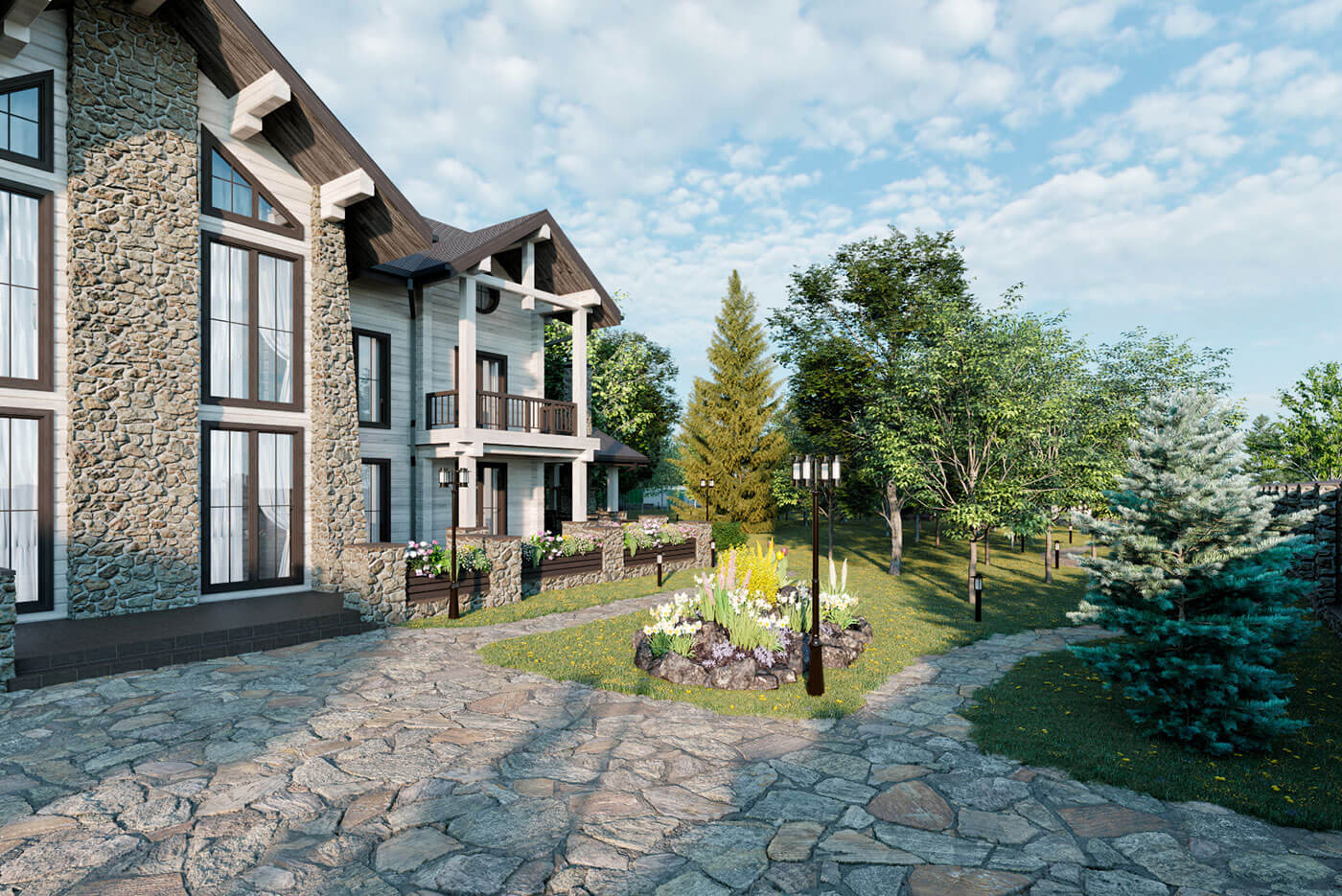 Цветовое решение: светлые стены с коричневой крышей и цоколем, контрастный камень в акцентах