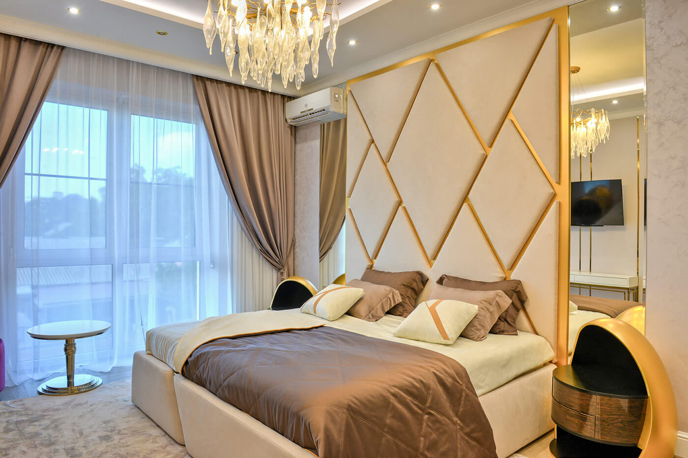 Интересным решением было оформить пространство первого этажа еще и мастер-спальней. Дело в том, что вместе с хозяевами живет пожилая бабушка, которой сложно подниматься на второй этаж. Рядом с комнатой сделали собственный гардероб и санузел, чтобы она чувствовала себя максимально комфортно в столь большом доме.