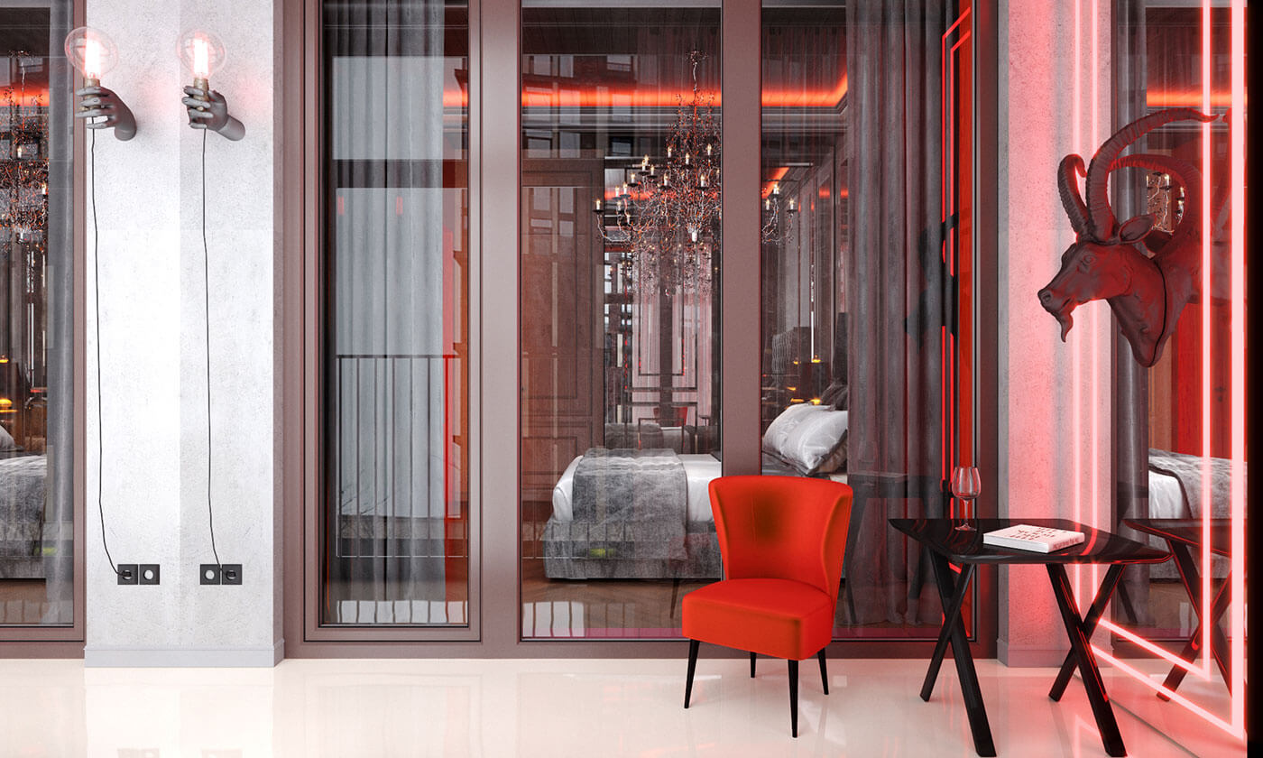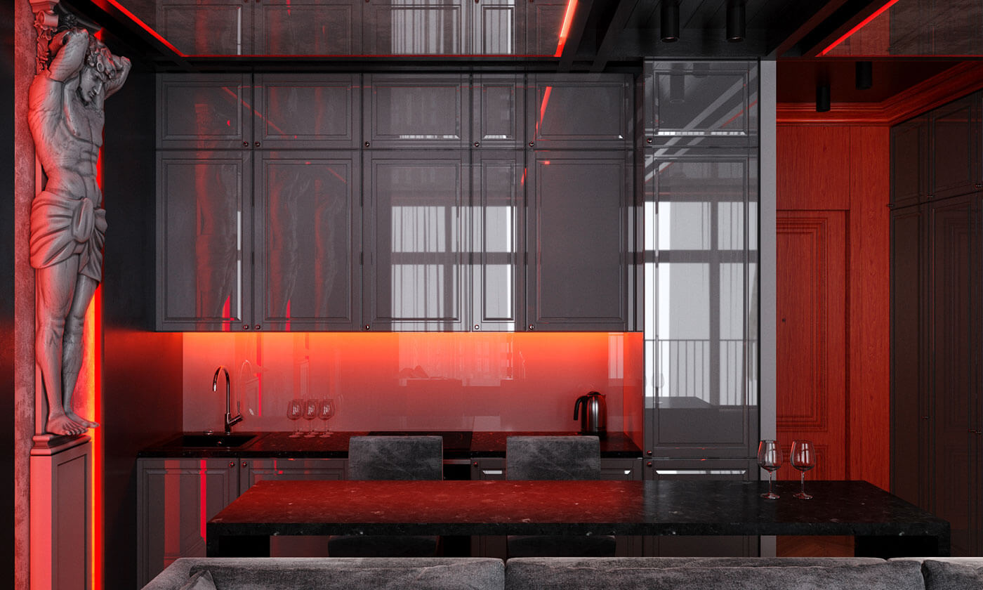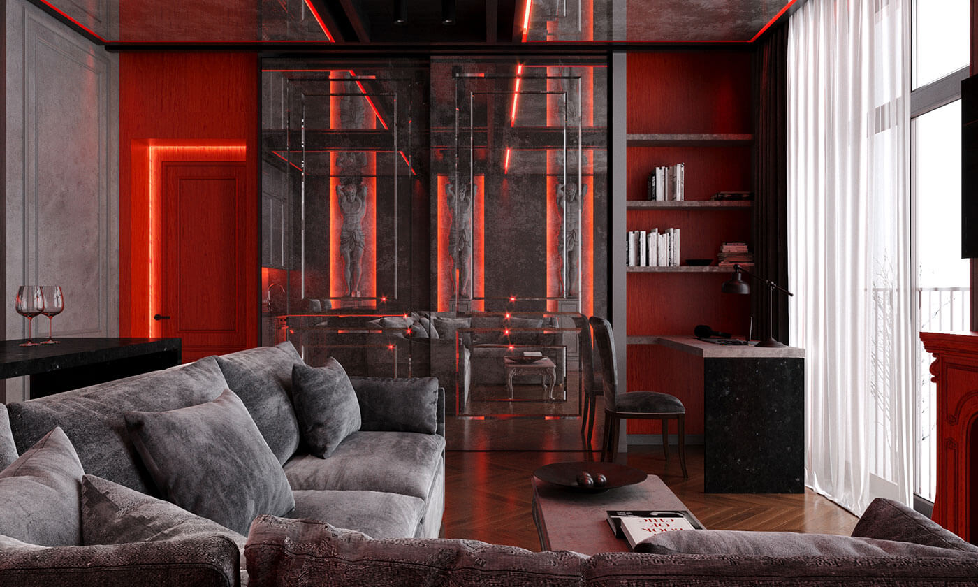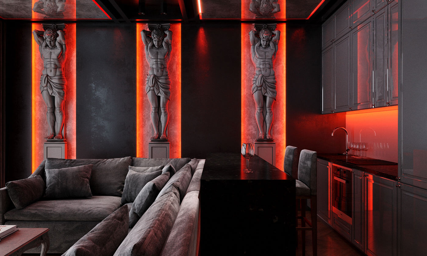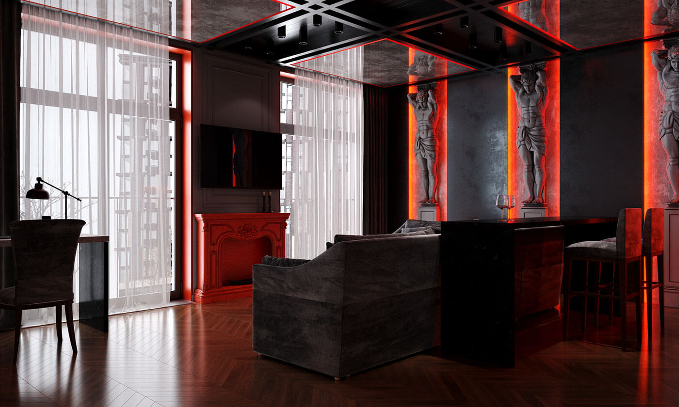 Гостиная представляет собой единение классики и готики с современными элементами, так же, как атланты символизируют единство божественного, земного и подземного мира.