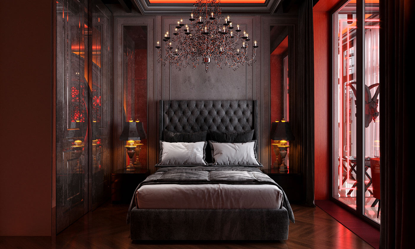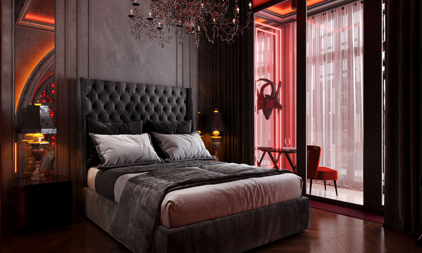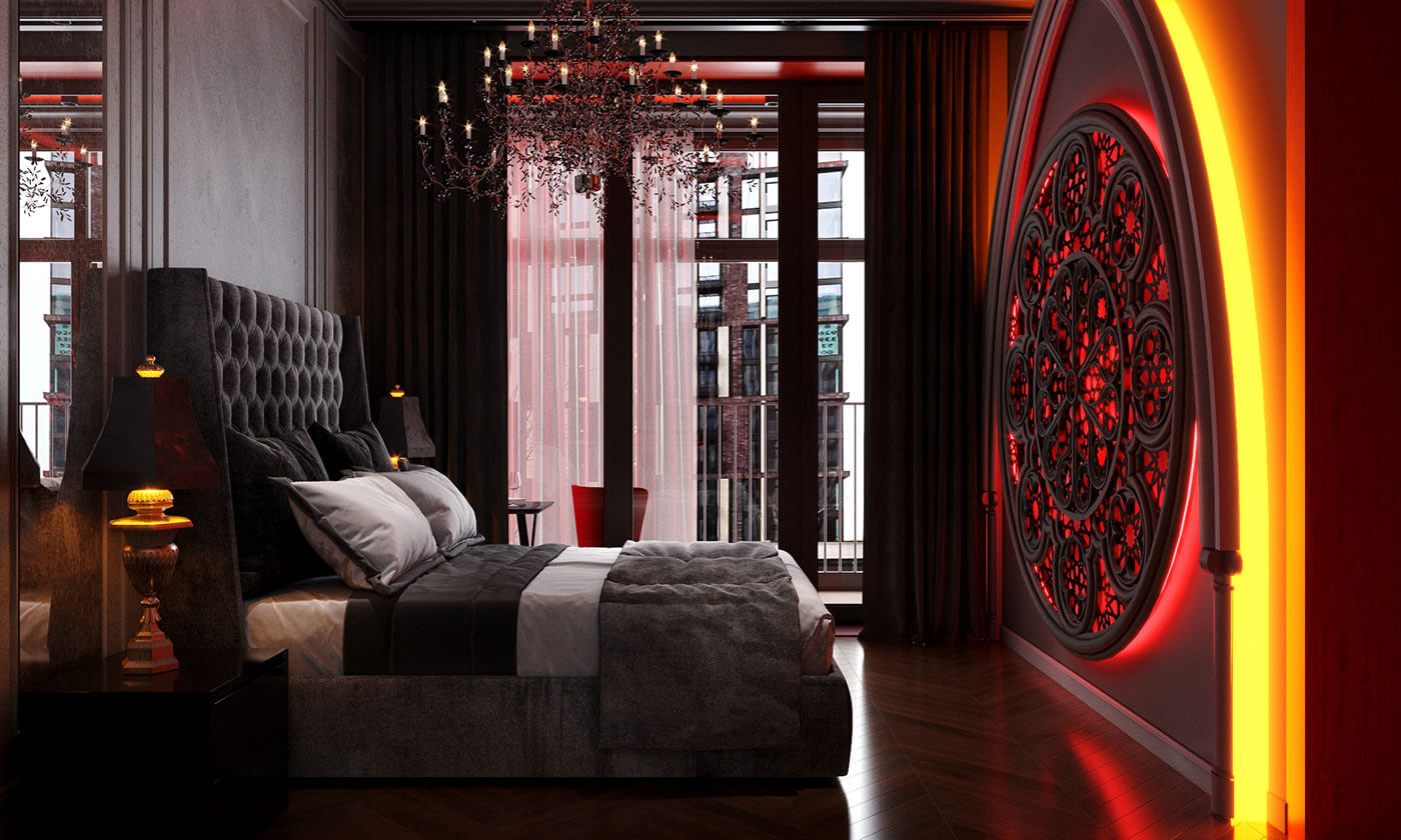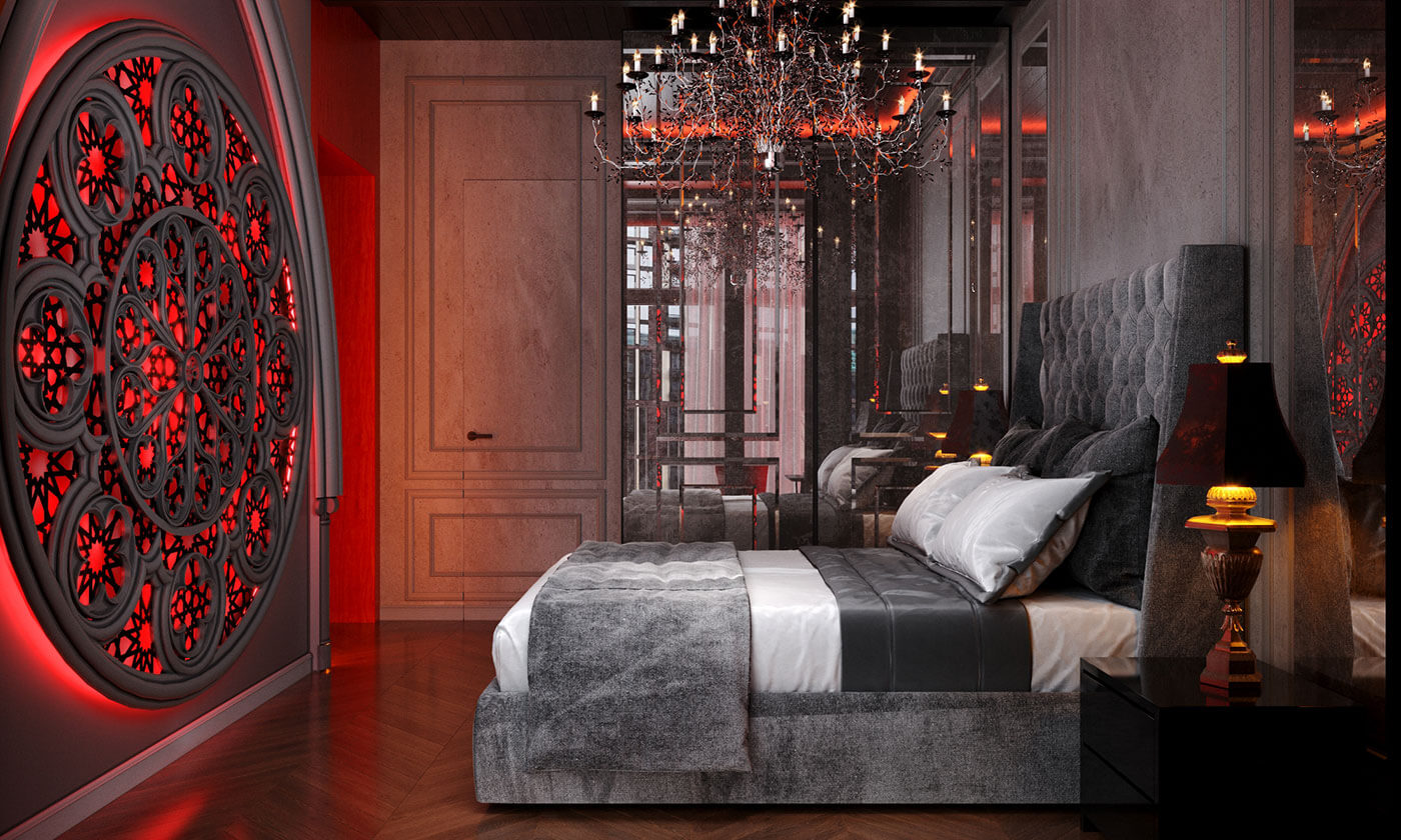 Спальня. Сочетание классики и готики в интерьере спальни рождает чарующую романтическую атмосферу, а готическая роза, в виде распустившегося цветка с симметрично расположенными лепестками, является символом божественной красоты, выражает цикличность и совершенство, придавая помещению поистине средневековую таинственность.