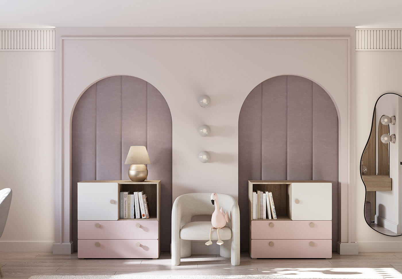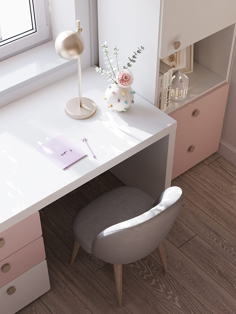 Две отдельные кровати и рабочие зоны обеспечивают каждой девочке необходимое личное пространство для отдыха, учебы и творчества. Комоды, шкафы и полки обеспечивают достаточно места для хранения одежды, игрушек и книг, помогая поддерживать порядок в комнате.