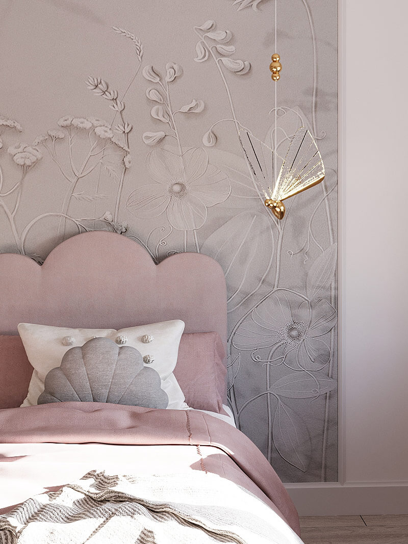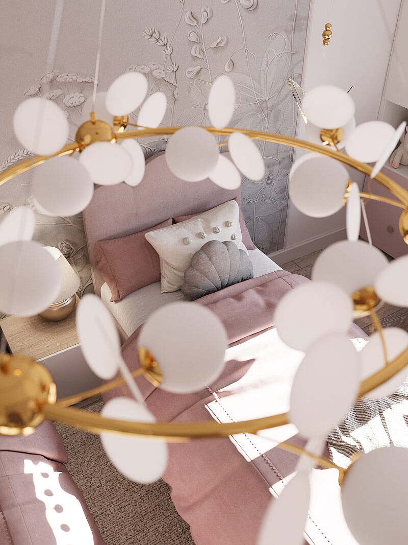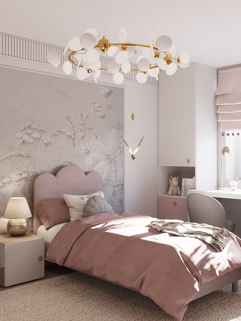 «Воздушная» люстра, зеркало с необычной рамой, мягкие игрушки и постеры с изображением сказочных персонажей создают волшебную атмосферу в комнате. Объемные обои с цветочными мотивами добавляют глубины и изысканности интерьеру.