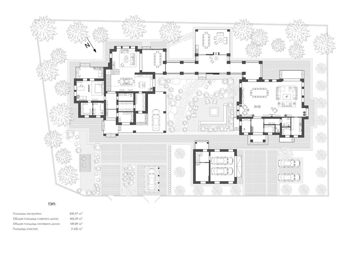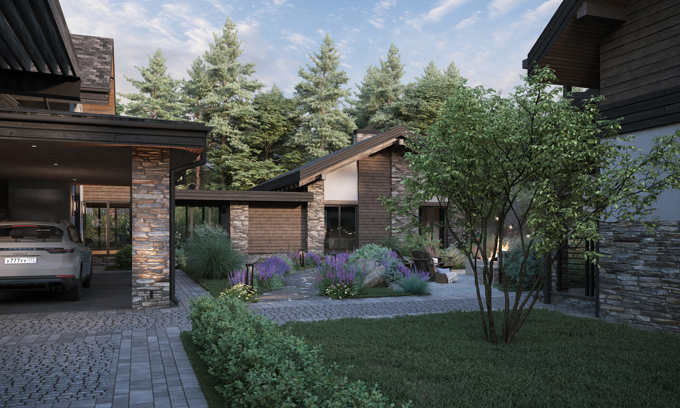 Территория загородного комплекса создана с точки зрения эргономики и эстетики, каждый сантиметр площади территории продуман с пользой для будущих владельцев. Пространство функционально разделено на зоны: въездную, основную (жилую), общую зону, вспомогательную и хозяйственную, зону уединенного отдыха (костровая зона).