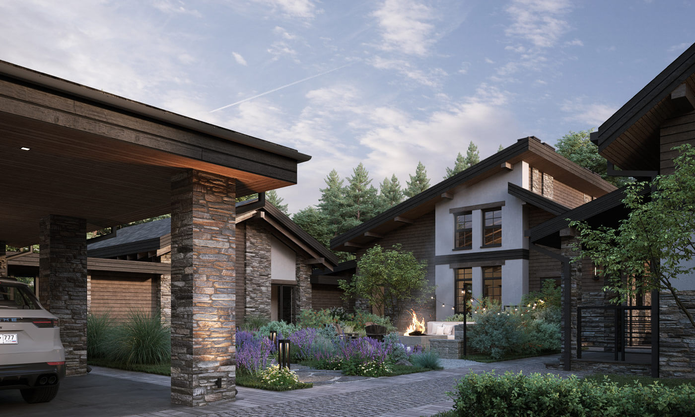 Проект загородного жилого комплекса выполнен в стиле шале. Кроме основного здания дома на территории располагается гостевой дом и гараж. Объекты выполнены в том же стиле с применением таких же материалов отделки, что и дом, это позволяет создать ощущения целостности и единства ансамбля.