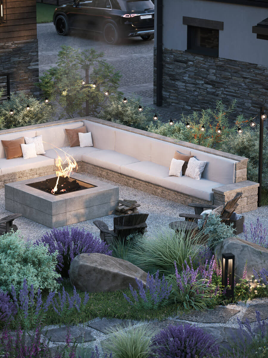 Малые архитектурные формы (скамья, пергола с качелями, кресло-шезлонг) выполнены из камня и дерева, они органично вписываются в сформированные функциональные зоны земельного участка. Особое внимание уделили декоративной подсветке жилого комплекса и окружающему пространству участка.