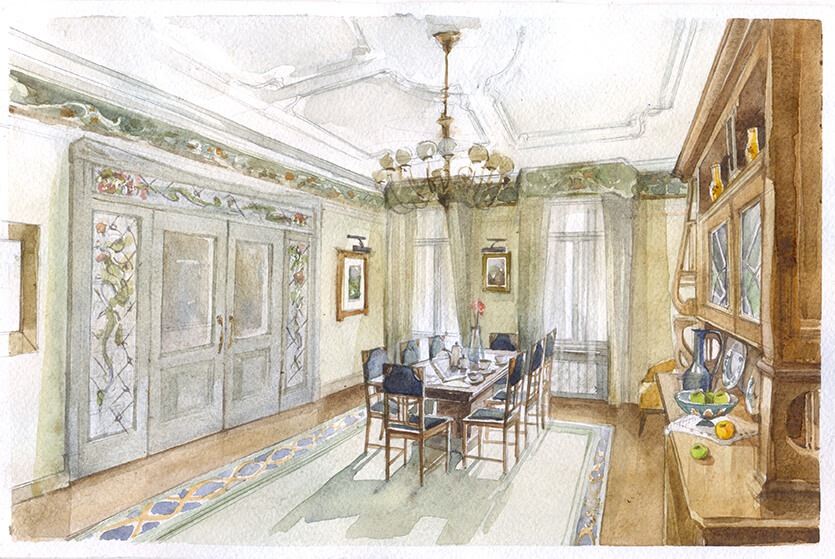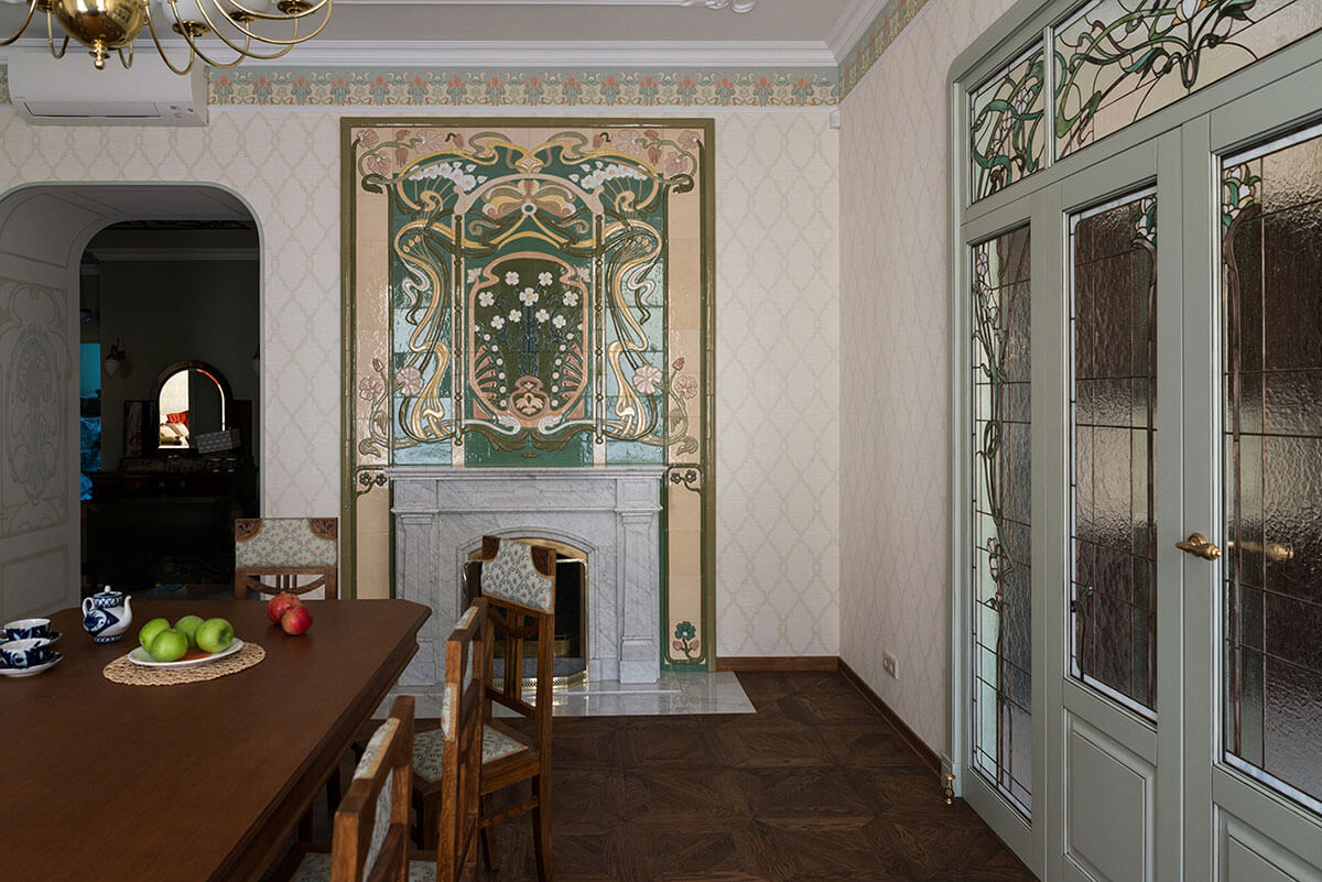Роспись на стенах, откосах, потолке и на дверях выполнена профессиональными художниками нашей студии. Все витражи в этом интерьере выполнены вручную в художественной мастерской нашей студии.