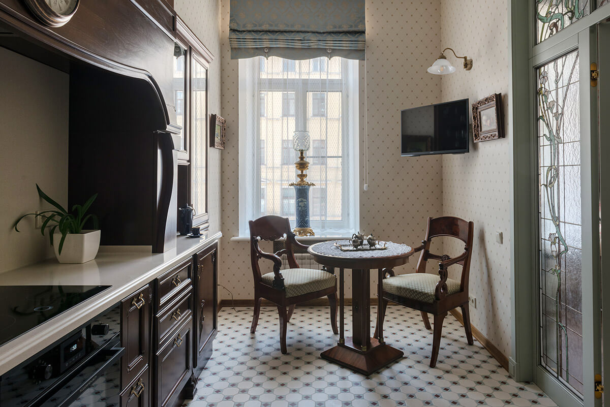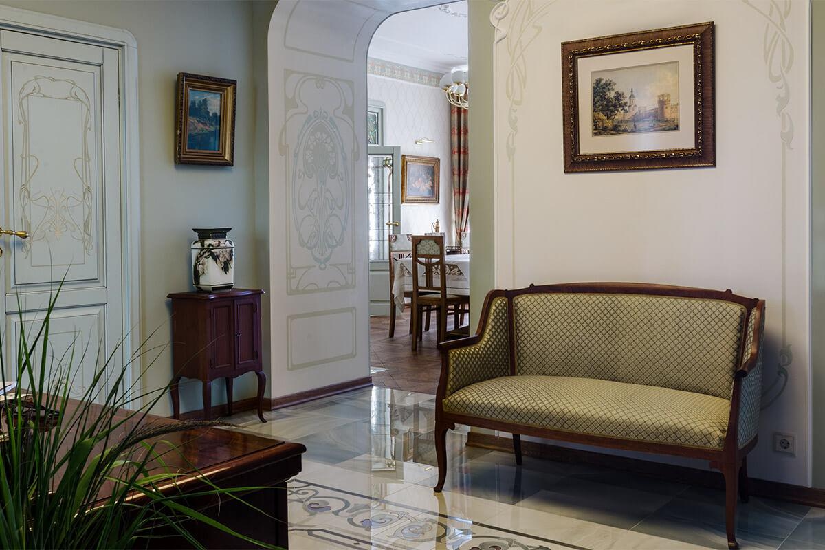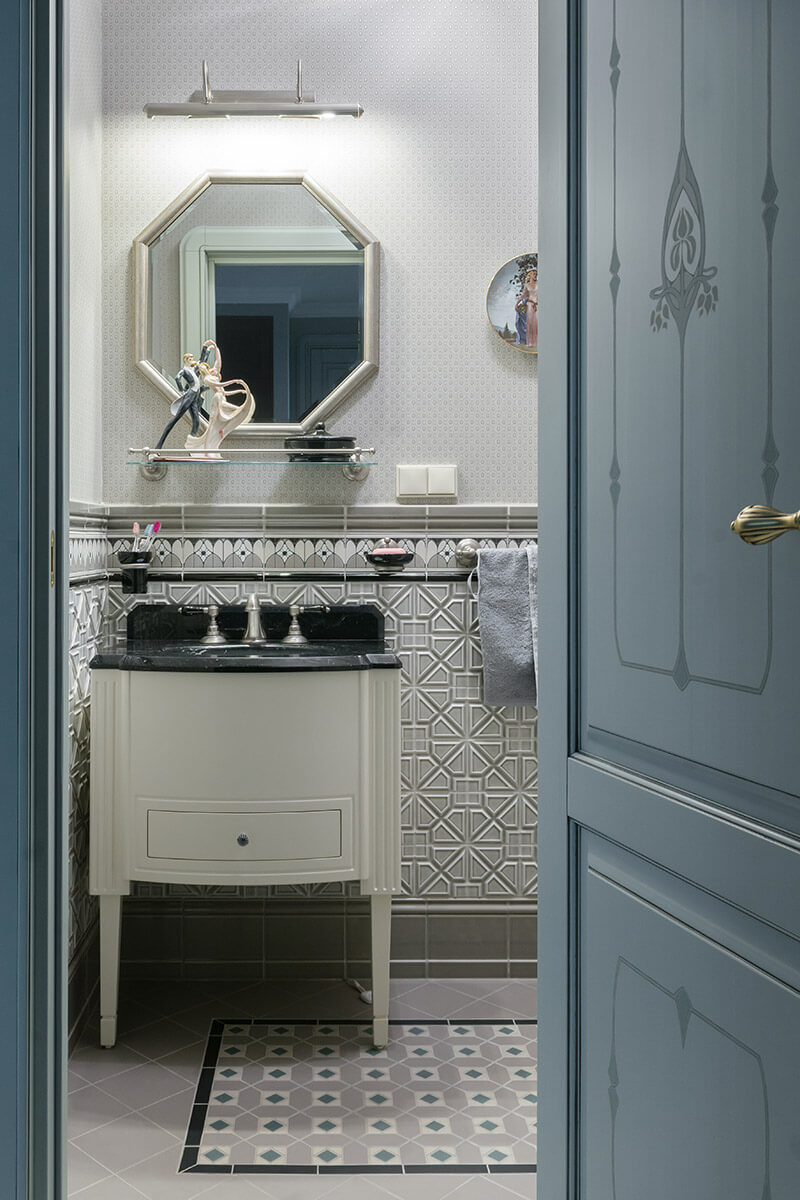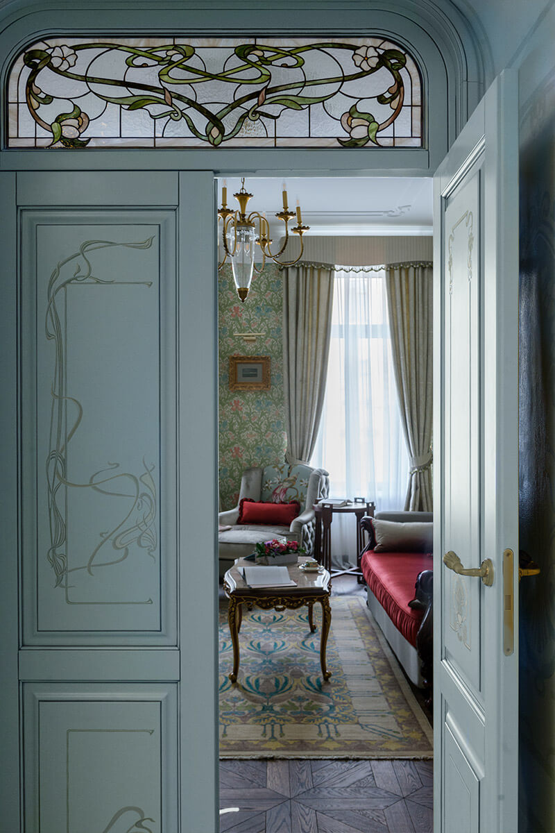 Впечатление изящества и утонченности подчеркивается декоративными элементами: текстилем, аксессуарами, витражом на двери, росписью ручной работы.