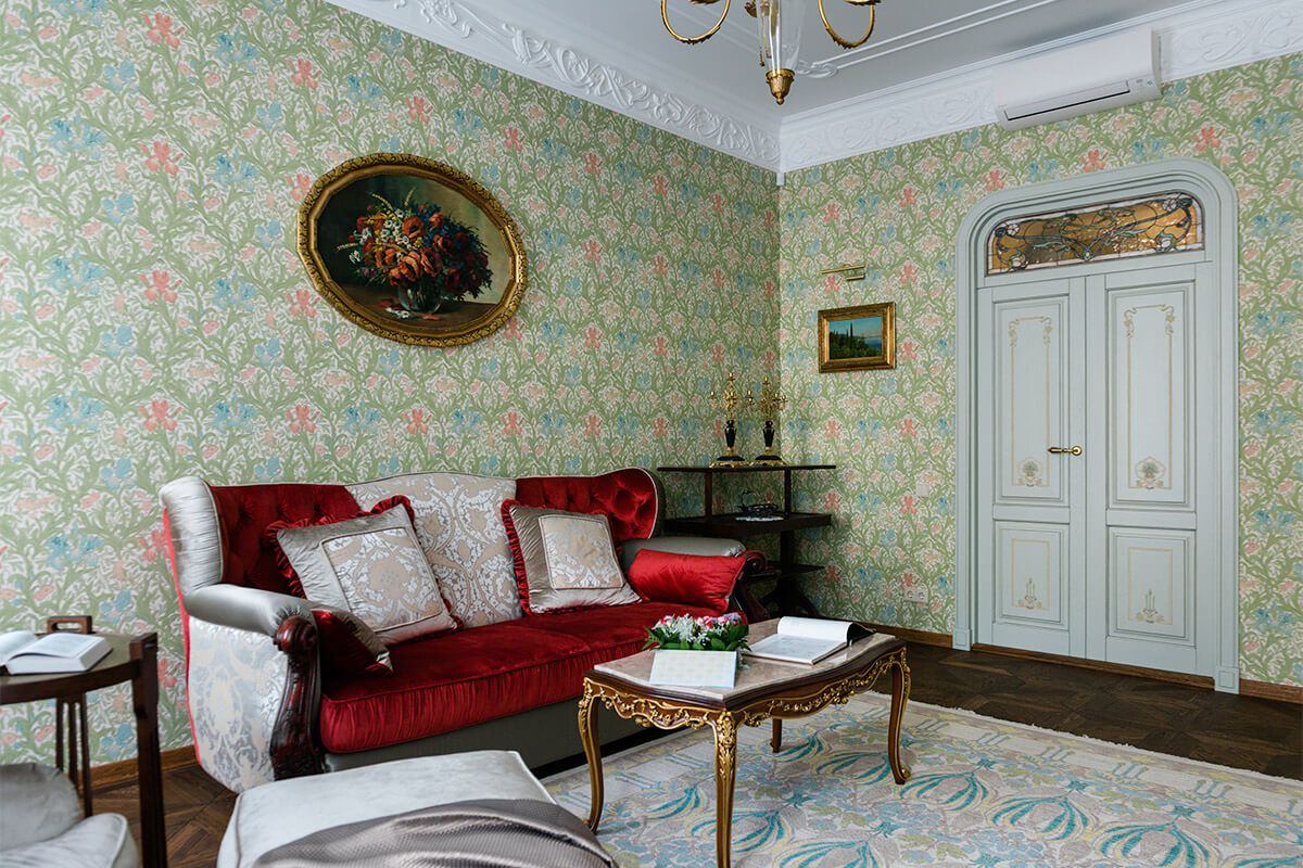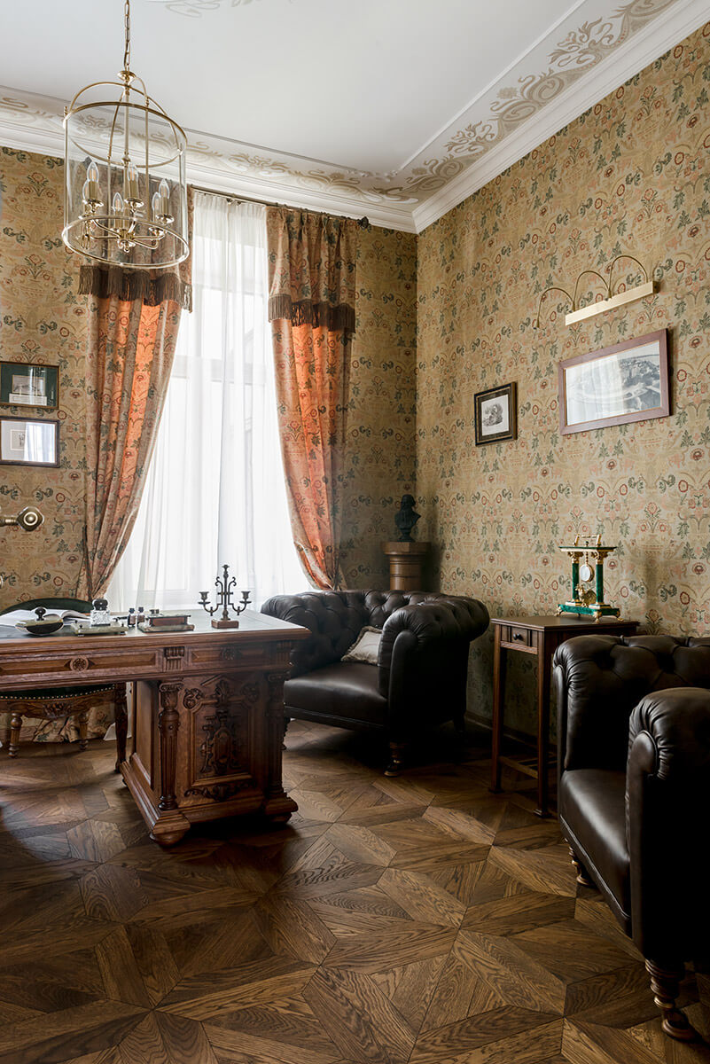 Потолок кабинета украшен расписным фризом, который дополняет рисунок на обоях и текстиле.