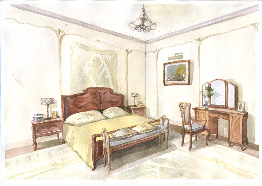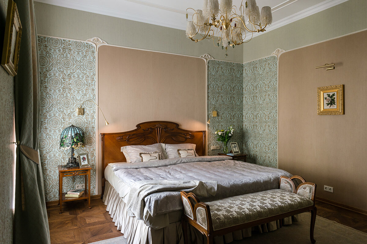 Вся обстановка спальной комнаты тщательно продумана и подобрана по цвету. Теплые и холодные оттенки пастельной гаммы чередуются друг с другом. Лепные элементы подчеркивают геометрические узоры на обоях.