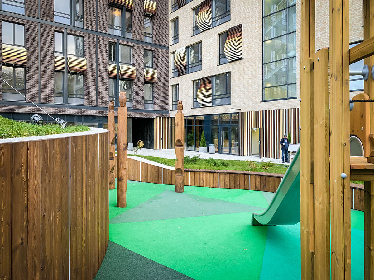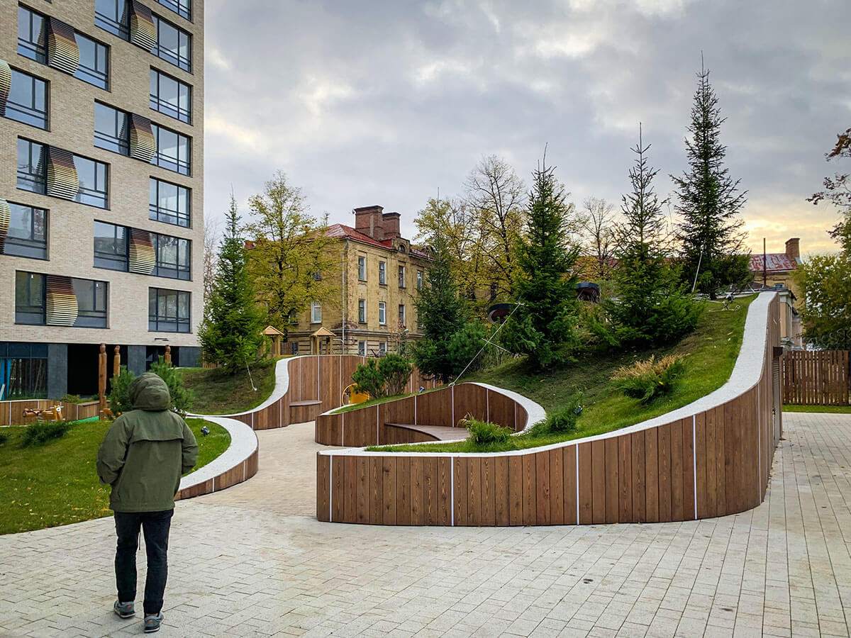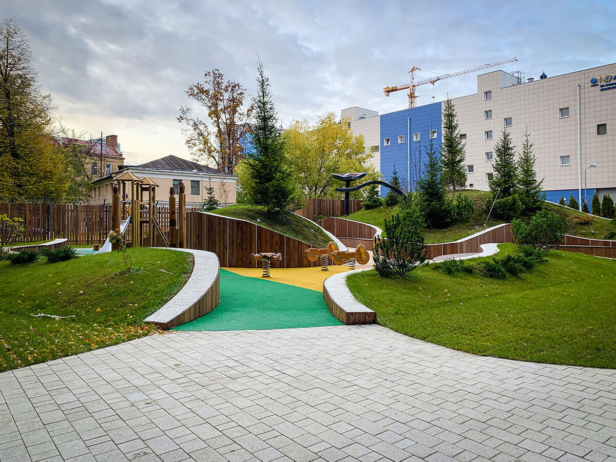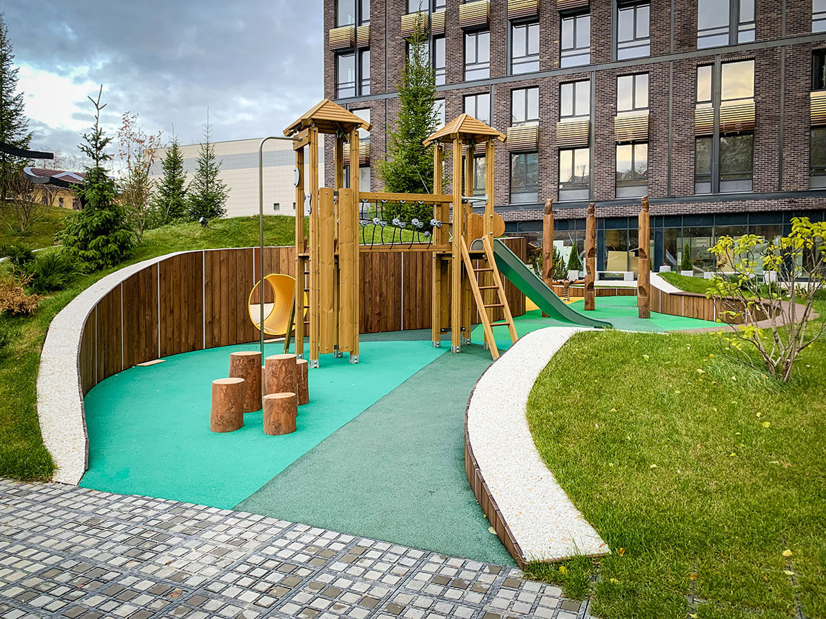 В прошлом году на конкурсе «Мода на ландшафт 2019» мы выставляли проект этого двора и стали победителями в номинации «Дизайн-проект. Общественное пространство». На реализацию проекта ушло чуть меньше года. Самым сложным было выполнить лекальные изогнутые подпорные стены. Частично стены отливались из бетона, частично выкладывались из кирпича. Для детской площадки были подобранные игровые элементы испанской компании Galopin, изготовленные из натурального дерева и металла.