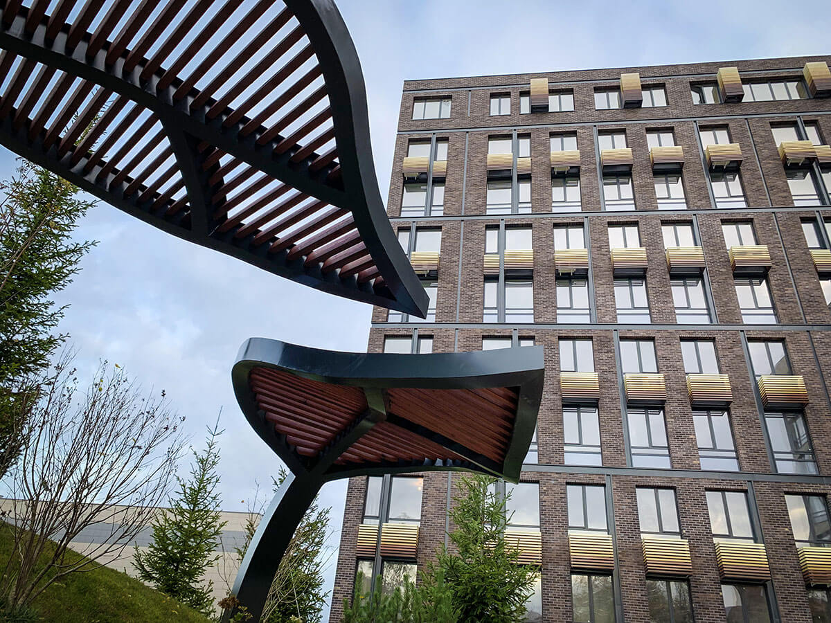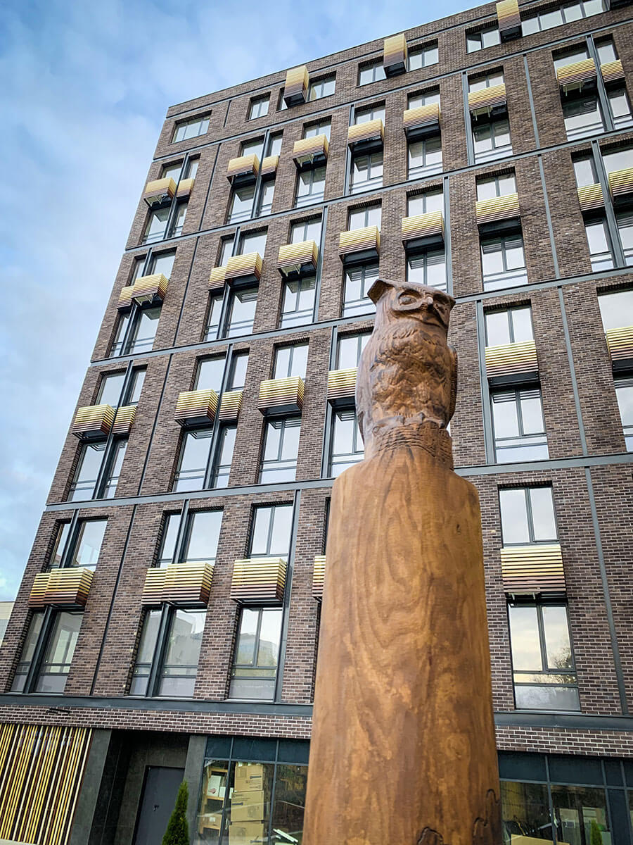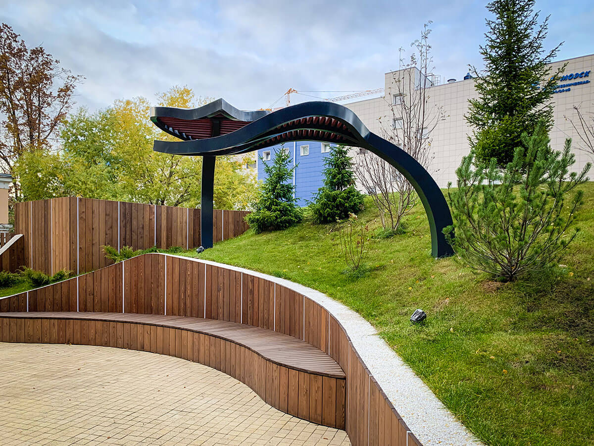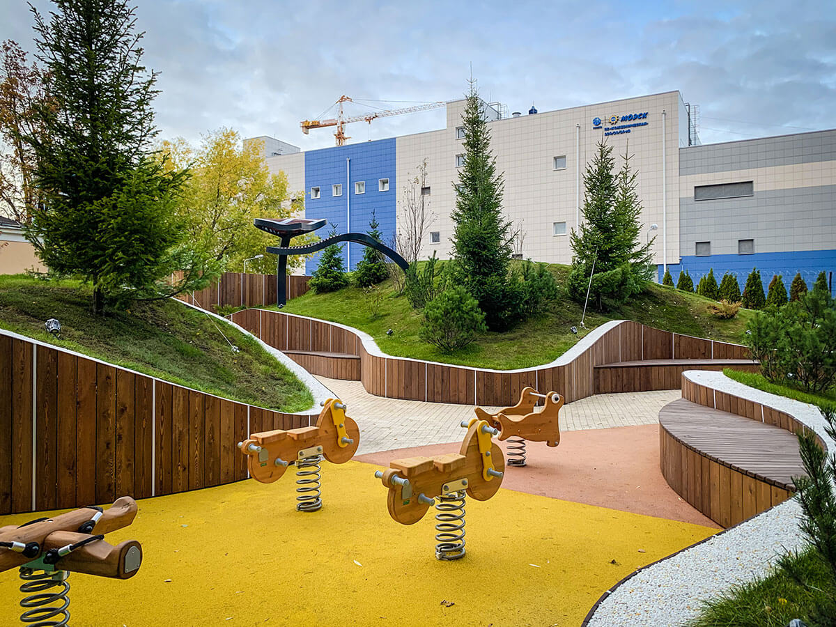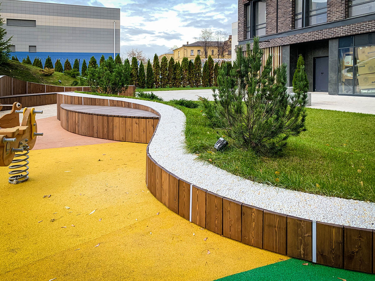 В прошлом году на конкурсе «Мода на ландшафт 2019» мы выставляли проект этого двора и стали победителями в номинации «Дизайн-проект. Общественное пространство». На реализацию проекта ушло чуть меньше года. Самым сложным было выполнить лекальные изогнутые подпорные стены. Частично стены отливались из бетона, частично выкладывались из кирпича. Для детской площадки были подобранные игровые элементы испанской компании Galopin, изготовленные из натурального дерева и металла.