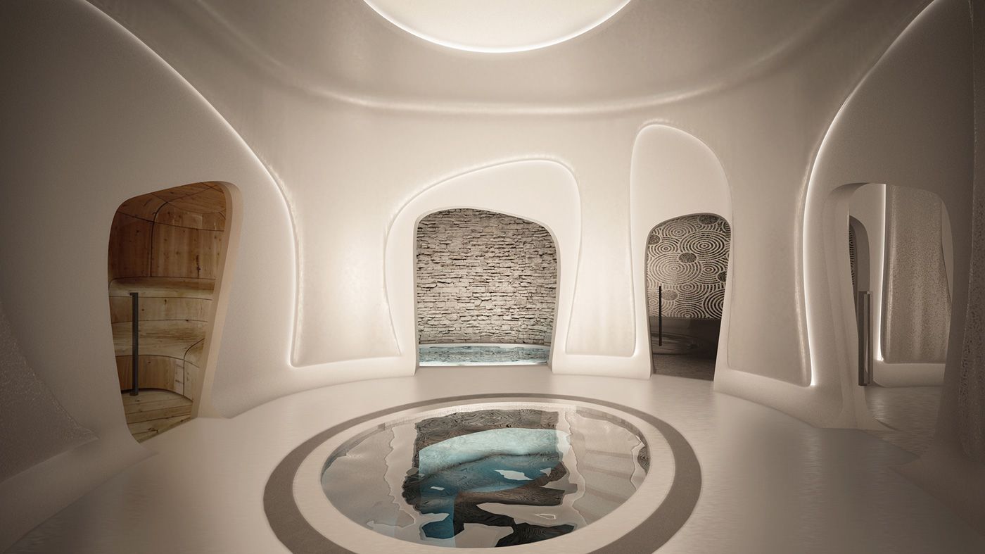 Светодиодные лентами RGB размещены на подвесном потолке. Шезлонги, специально разработанные для этого проекта, отражают современный стиль дизайна интерьера.